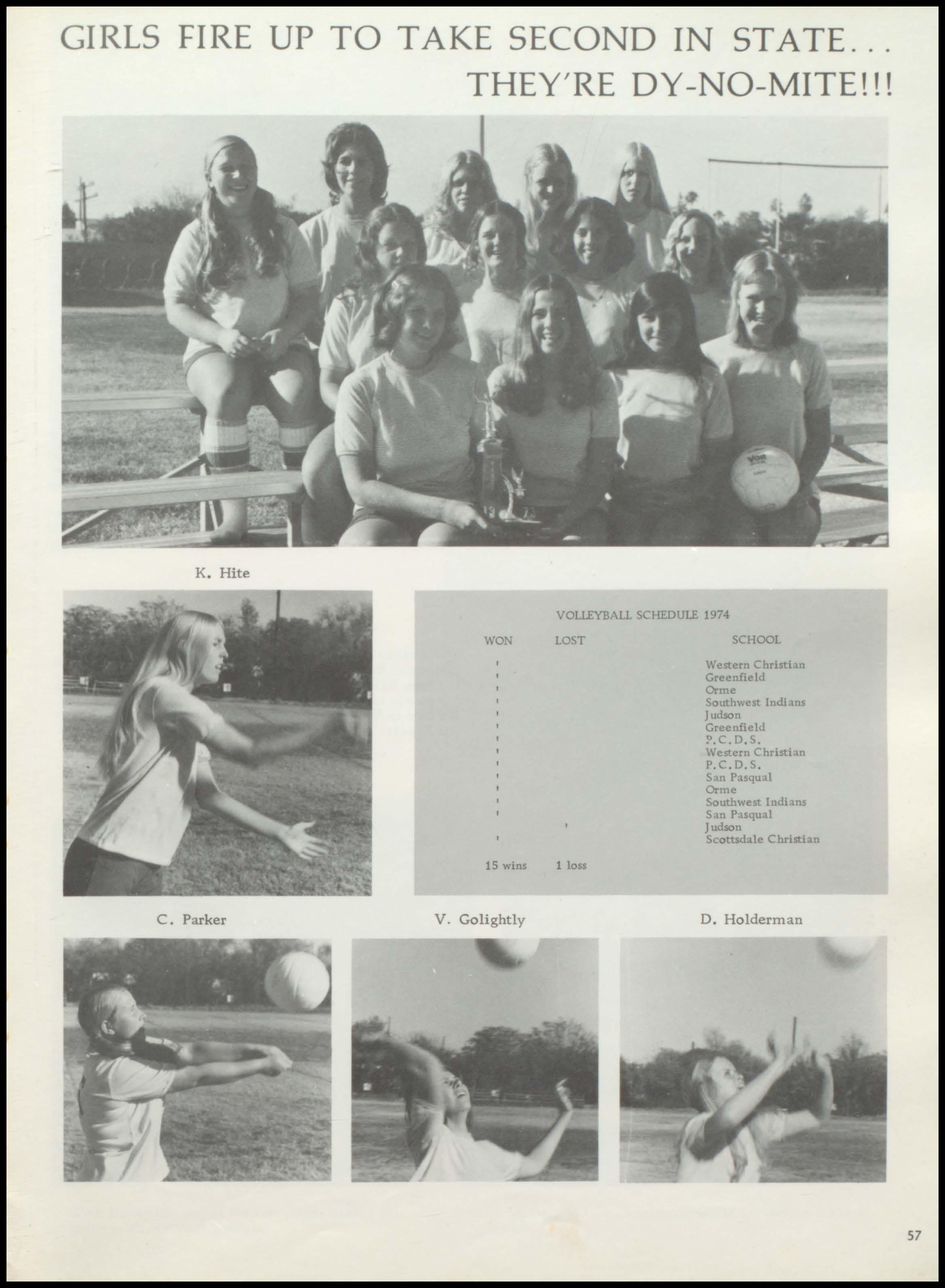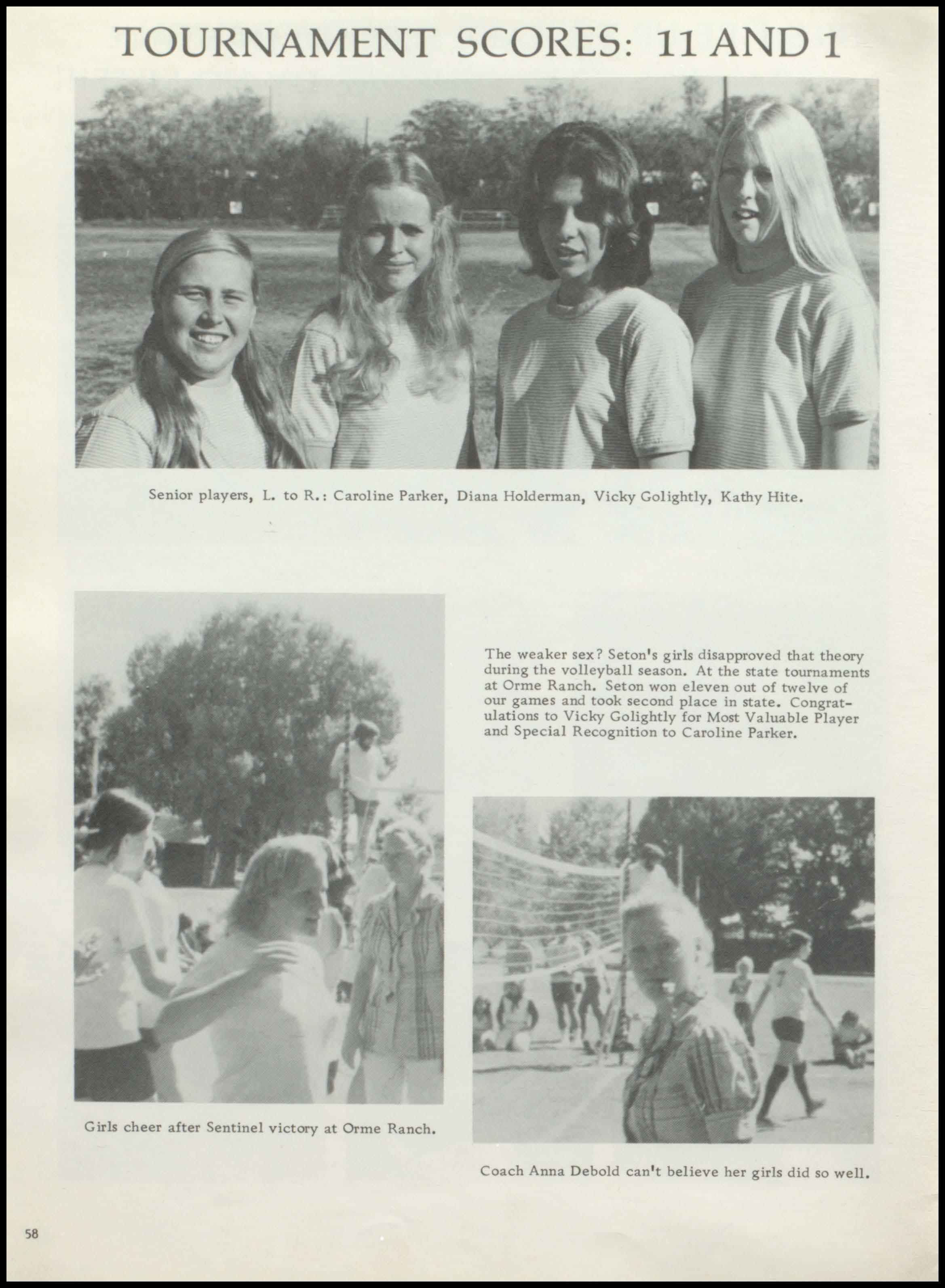 The weaker sex? Seton's girls disapproved that theory during the volleyball season. At the state tournaments at Orme Ranch. Seton won eleven out of twelve of our games and took second place in state. Congratulations to Vicky Golightly for Most Valuable Player and Special Recognition to Caroline Parker.