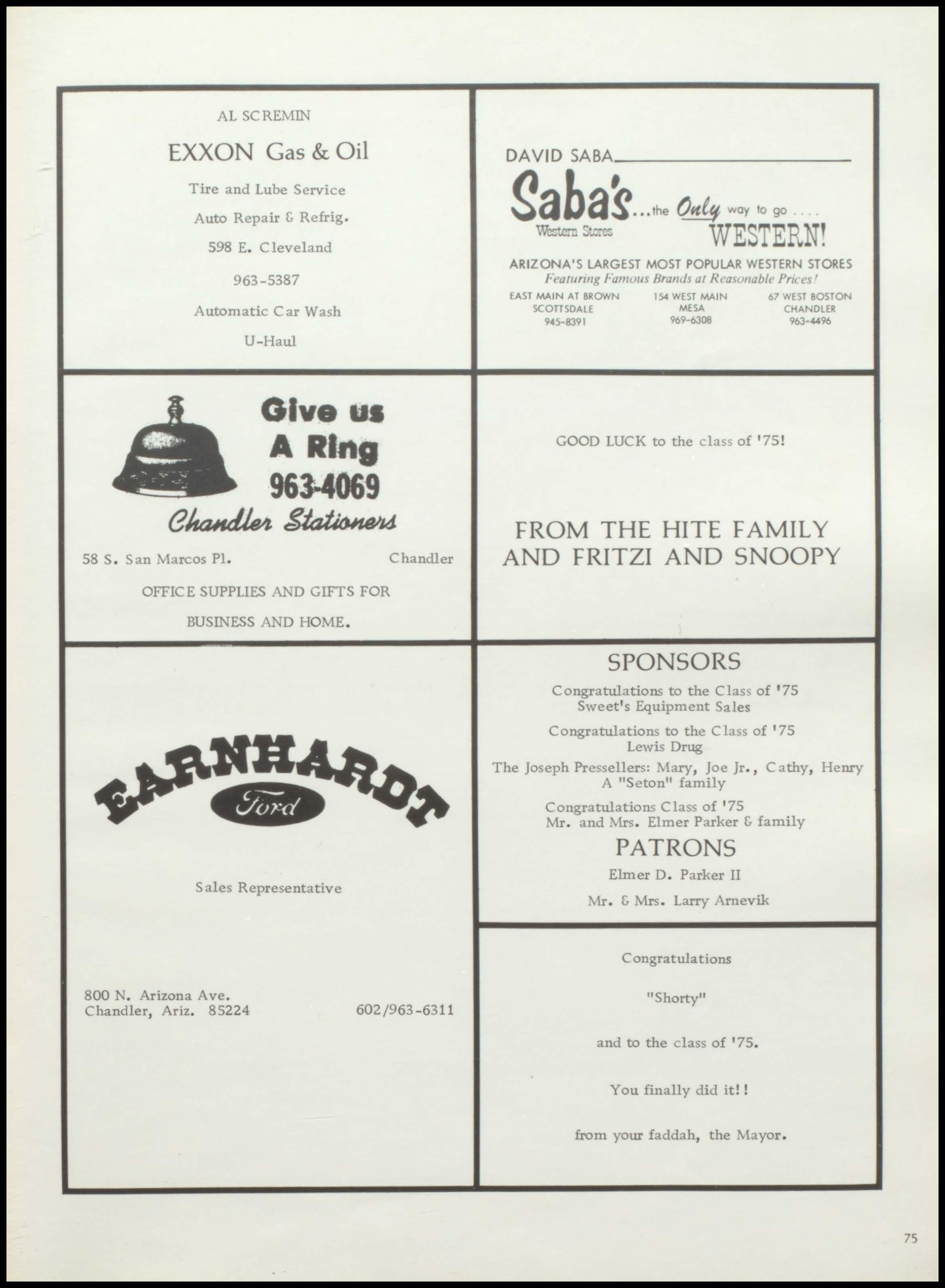 AL SCREMIN EXXON Gas & Oil Tire and Lube Service Auto Repair & Refrig. 598 E Cleveland 963-5387 Automatic Car Wash U - Haul Glv us A Rl"g 96).4069 58 S San Marcos Pl Chandler OFFICE SUPPLIES AND GIFTS FOR BUSINESS A.ND H O ME Sales Representative 8 00 • Ari zona Ave . Cha n d l er , Ariz . 852 2 4 6 0 2/963- 6 3 11