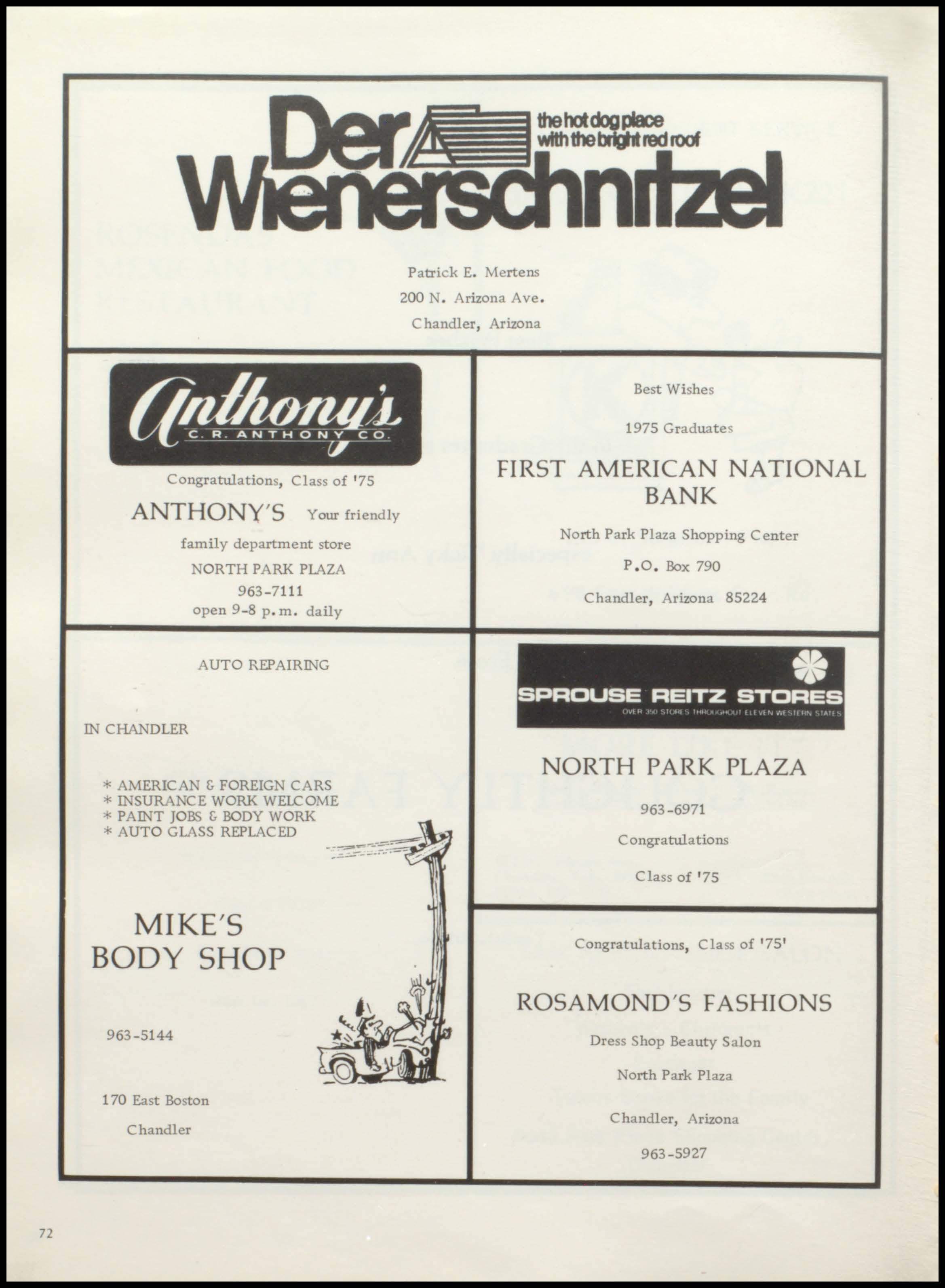 72 Congratulations, Class of 1 75 Patrick E. Mertens 200 • Arizona Ave Chandler, Arizona Best Wishes 1975 Graduate s ANTHONY 'S Your friendly FIRST AMERICAN NATION A L BANK family department store ORTH PARK PlAZA 963-7111 open 9-8 p m. daily AUTO REPAIRING IN CHANDLER AMERICAN & FOREIGN C.\RS *I TSURANCE WORK WELCOME P \INT JOBS & BODY WORK * AUTO GLASS REPlACED MIKE 'S BODY SHOP 963-5144 1 70 East Boston Chandler North Park Plaza Shopping Center P 0 Box 790 Chandler, Arizona 85224 • SPROUSE REITZ STORES ''"'' H '• ',To ,.,1 '"*' " •'"' I, I 111 ' IA't o.., NORTH PARK PLAZA 963-6971 Congratulations Class of 175 Congratulations, Class of '75 1
