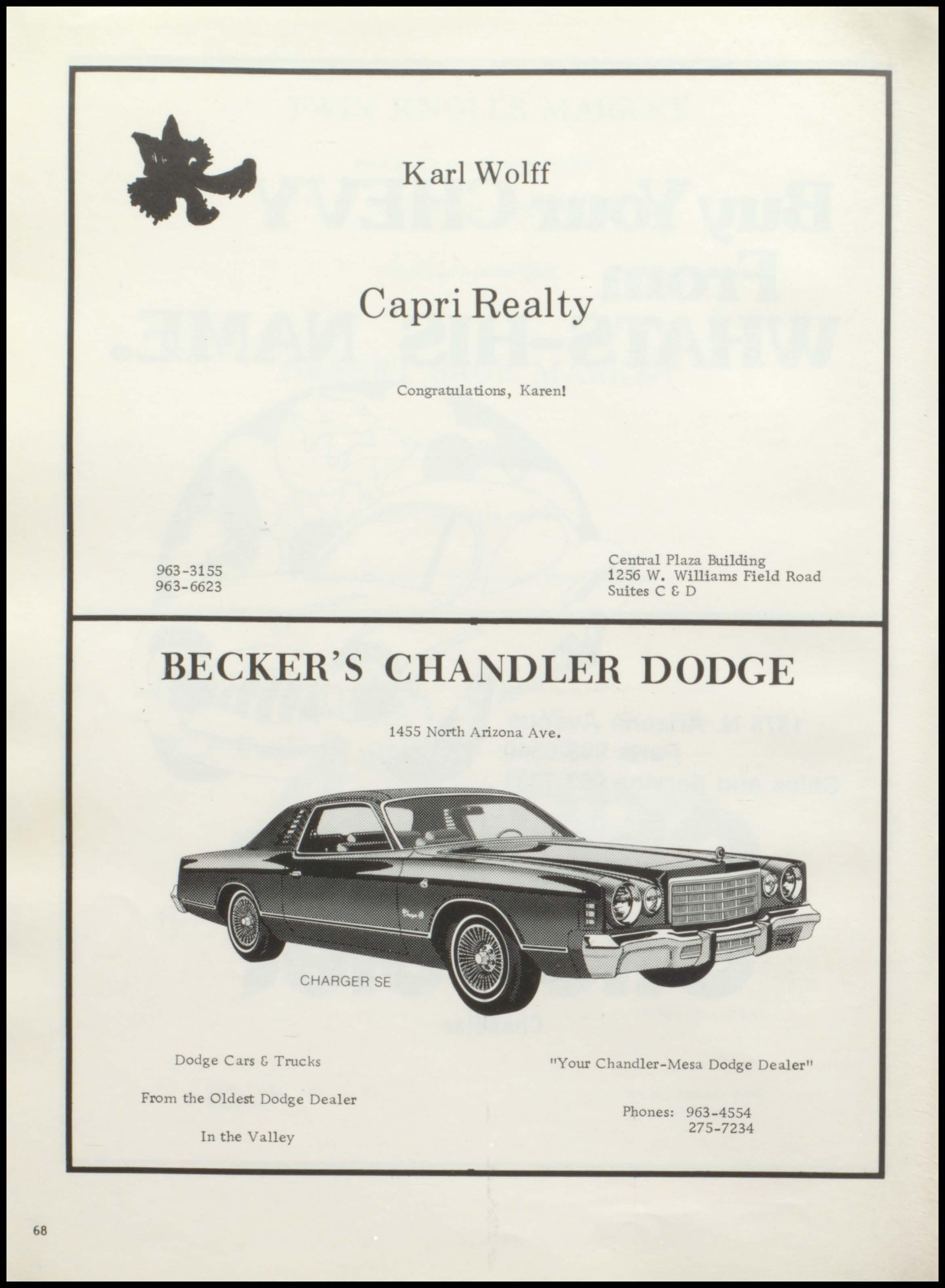 68 963-3 1 55 963 - 6623 Karl Wolff Capri Realty Congratulations, Karen ! Central Plaza Building 1 256 W Williams Field Road Suites C & D BECKER'S CHANDLER DODGE 1455 ·orth Arizona Ave CHARGER SE Dodge Cars & Trucks From the Olde st Dodge Deale r I n the Valley "Your Chand l er-Mesa Dodge Dealer" Phones: 963 - 4554 275 - 7234