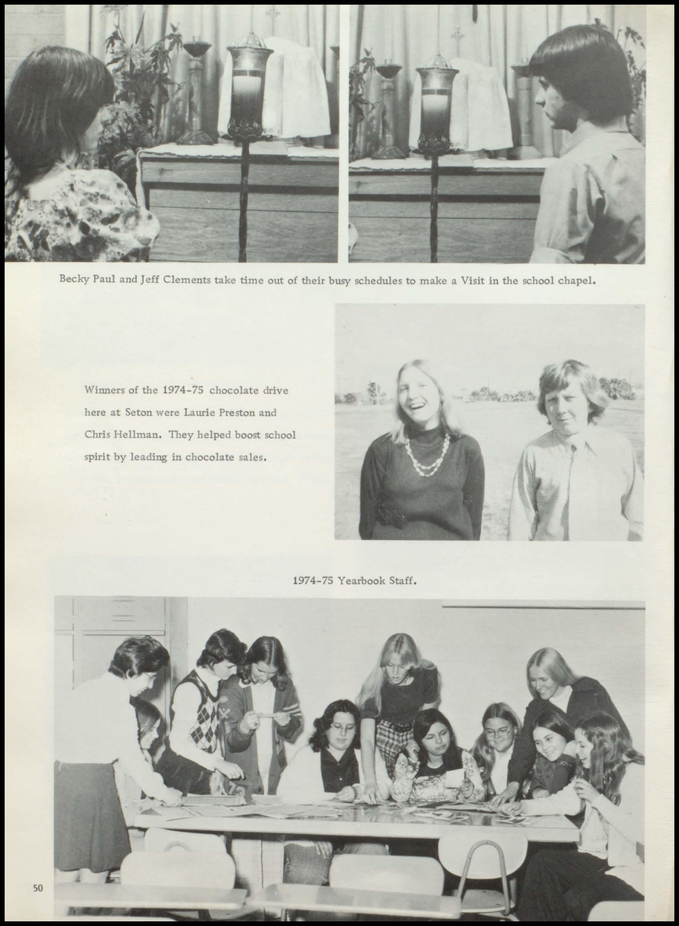 Winners of the 1974-75 chocolate drive here at Seton were Laurie Preston and Chris Hellman. They helped boost spirit by leading in chocolate sales .