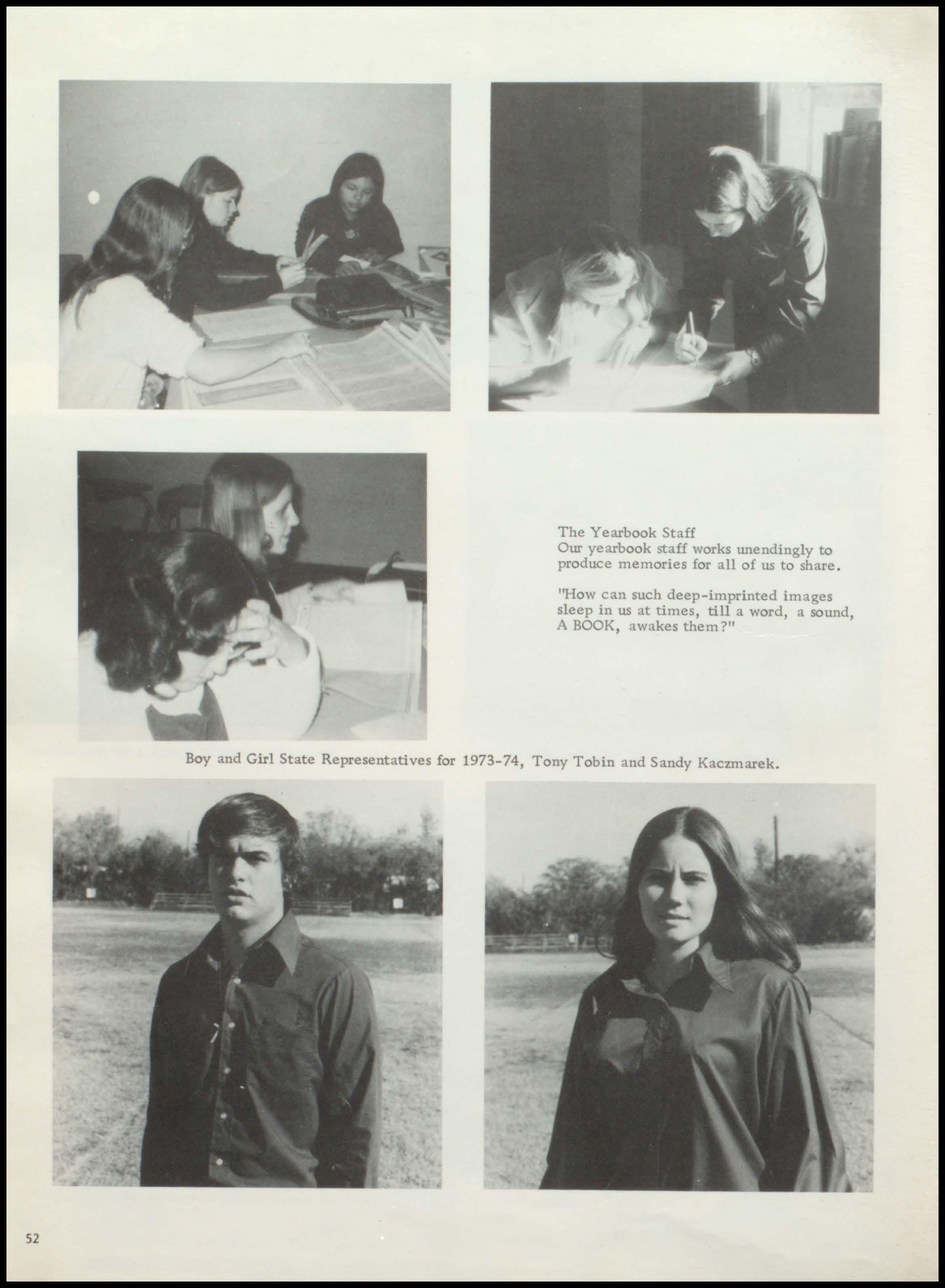 Boy and Girl State Representatives for 1973-74, Tony Tobin and Sandy Kaczmarek.