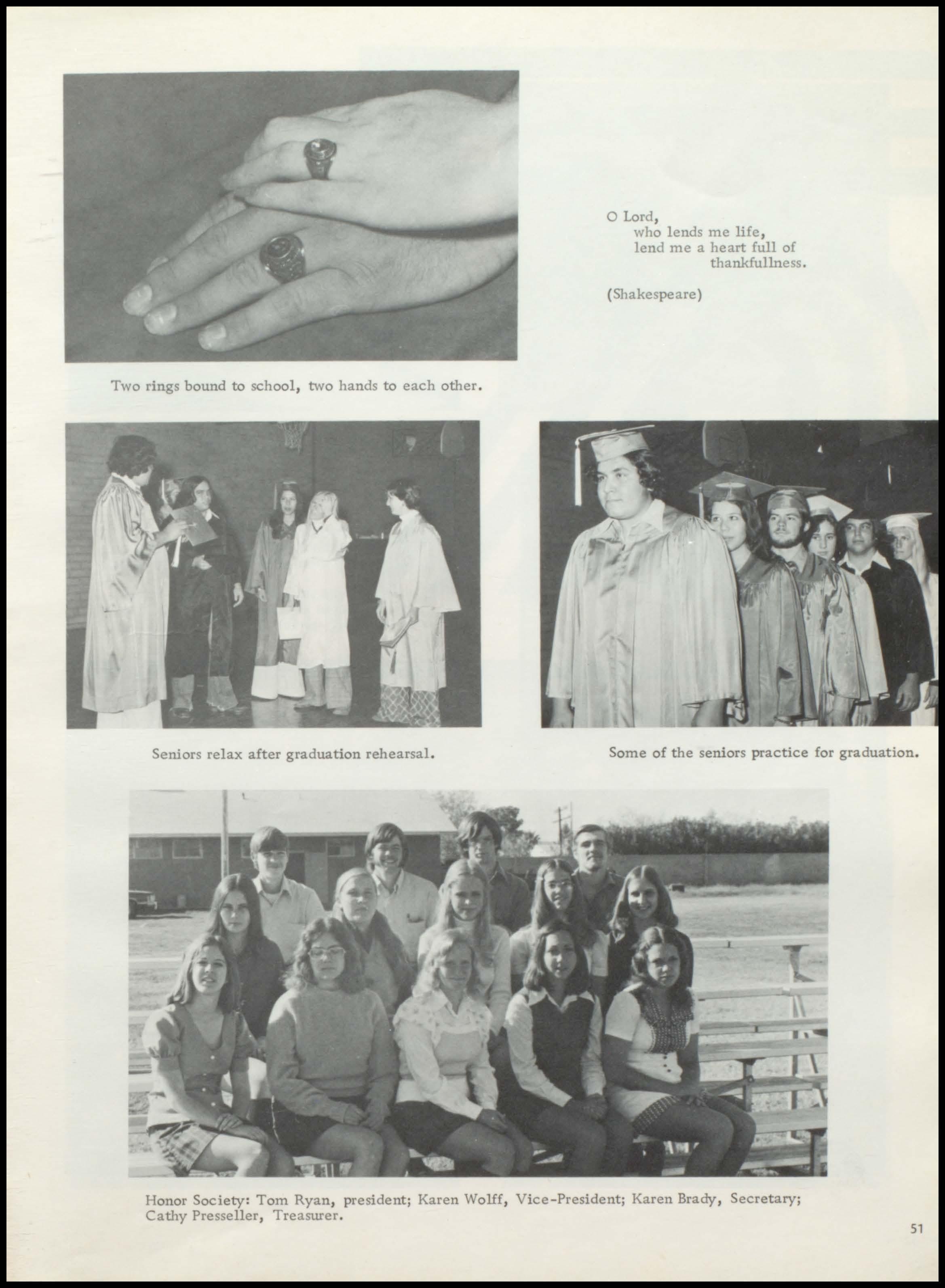 Honor Society: Tom Ryan, president; Karen Wolff, Vice-President; Karen Brady, Secretary; Cathy Pre seller , Treasurer