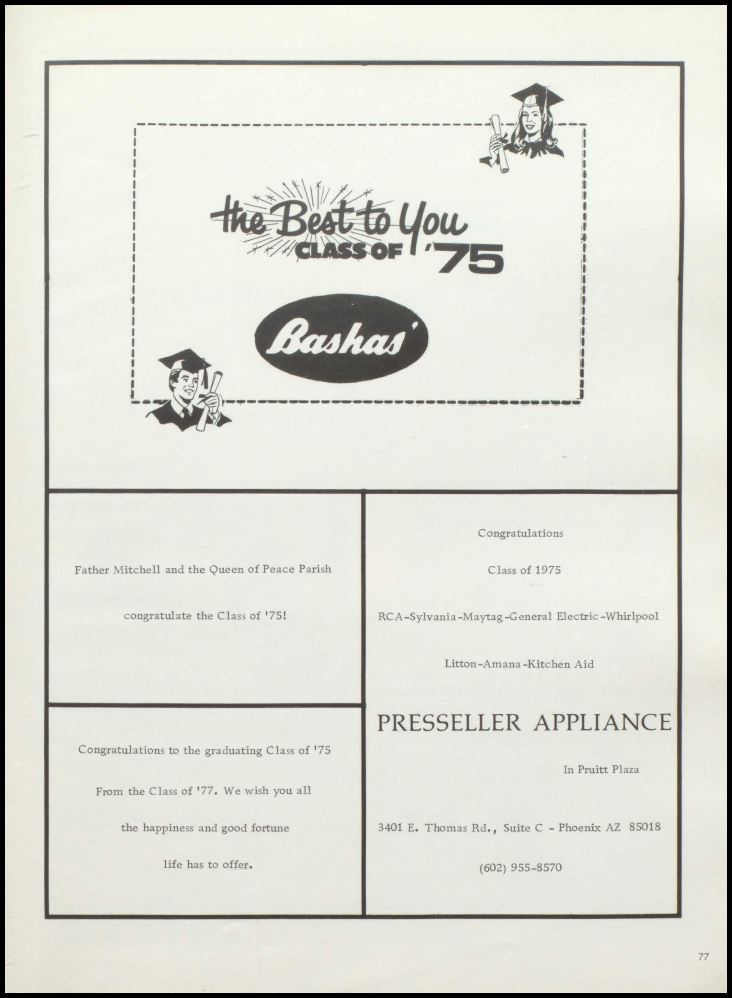 I I I I •t t I I ..' I I I I I ' I ' I I I • •J _______ ._.._ ... ·-----------C ongra tula tions Father Mitchell and the Queen of Peace Parish Class of 1975 congratulate the Class of '75! RCA-Sylvania-Maytag-General Electric -Whirlpool Litton-Amana-Kitchen Aid PRESSELLER APPLIANCE Congratulations to the graduating C la s of '75 In Pruitt Plaza From the Class of '77. We wish you all the happiness and good fortune 3401 E. Thomas Rd ., Suite C - Phoenix AZ 85018 life has to offer (602) 955-8570 77