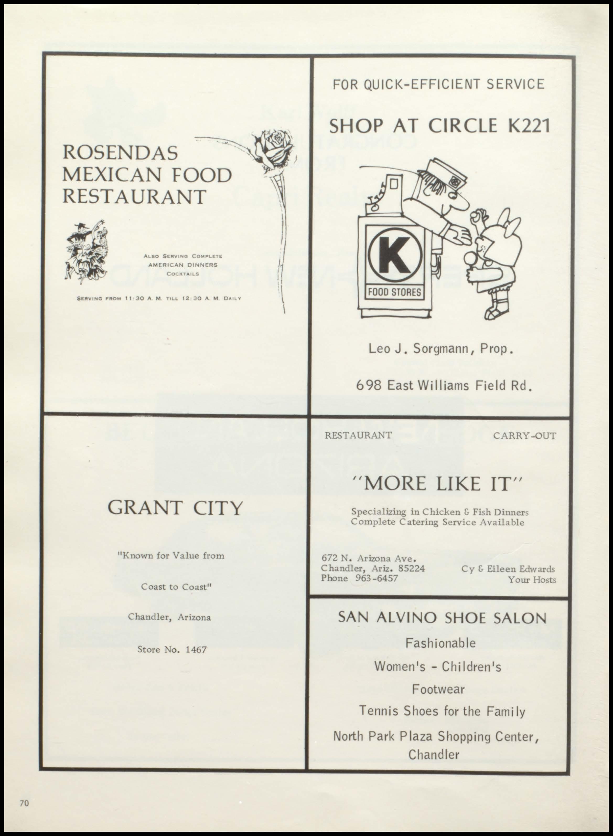 70 ROSENDAS MEXICAN FOOD RESTAURANT ALSO SCIItV ING C0"4,.LETE AMERICAN DINNERS COCKTAILS SE"VING FROM t 1 30 A M TILL 12 30 A M 0AIL V GRANT CITY "Known for Value from Coast to Coast" Chandler, Arizona Store No 1467 FOR QUICK-EFFICIENT SERVICE SHOP AT CIRCLE K221 FOOD STORES Leo J. Sorgmann 1 Prop. 698 East Williams Field Rd. RESTAURANT CARRY-OUT "MORE LIKE IT " Specializing in Chicken & Fi. h Dinners Complete Catering Service Available 672 N . Arizona Ave . Chandler, Ariz 85224 Phone 963 -6457 C y & Eileen Edwards Your Hosts SAN ALVINO SHOE SALON Fashionable Women's- Children's Footwear Tennis Shoes for the Family North Park Plaza Shopping Center 1 Chandler