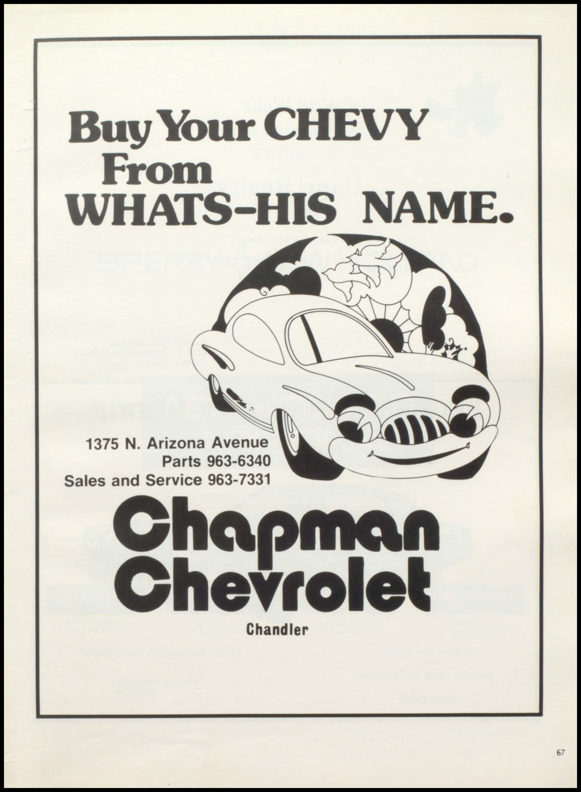 Buy Your CHEVY From WHATS-HIS NAME. 1375 N. Arizona Avenue Parts 963-6340 Sales and Service 963-7331