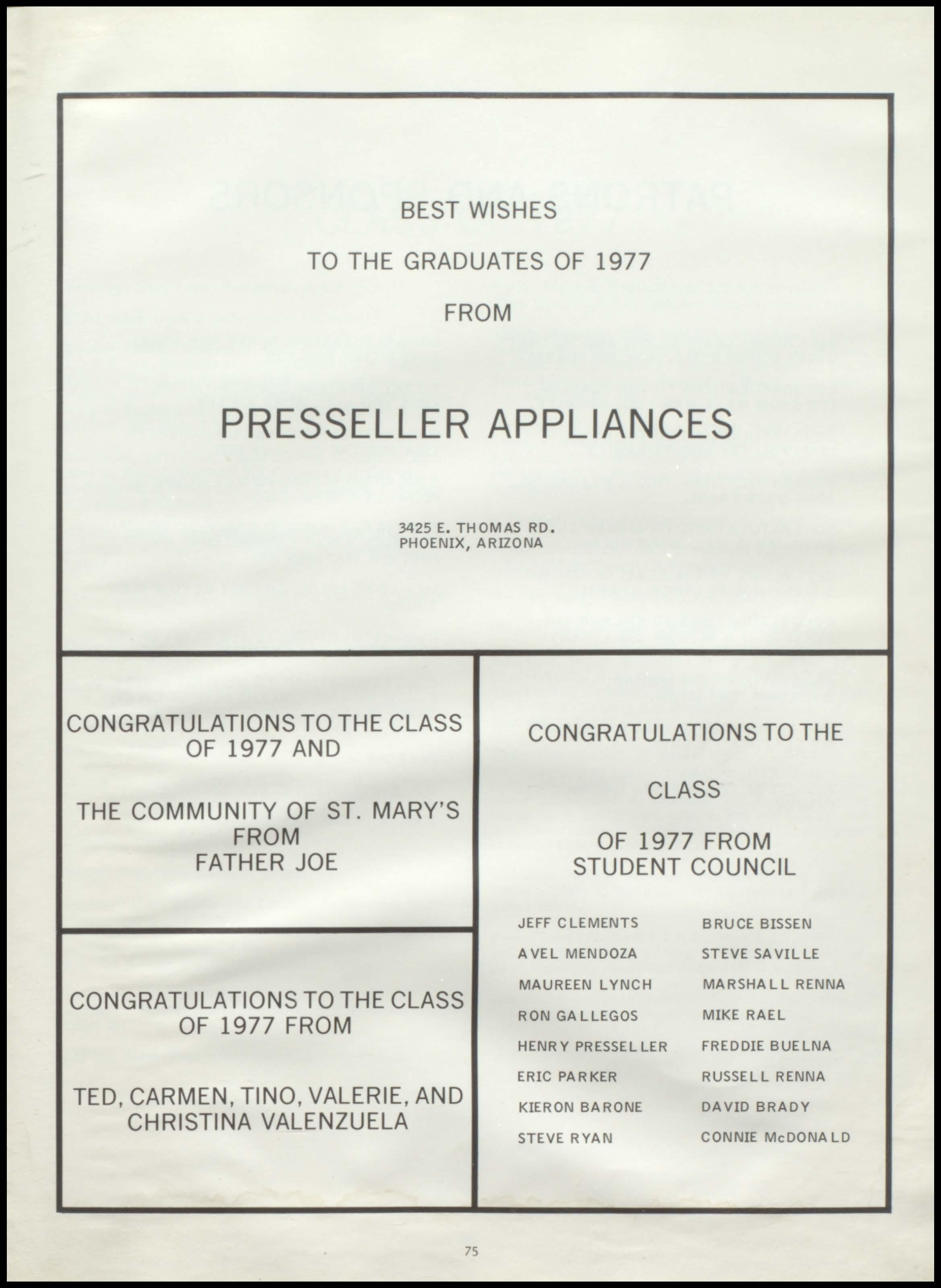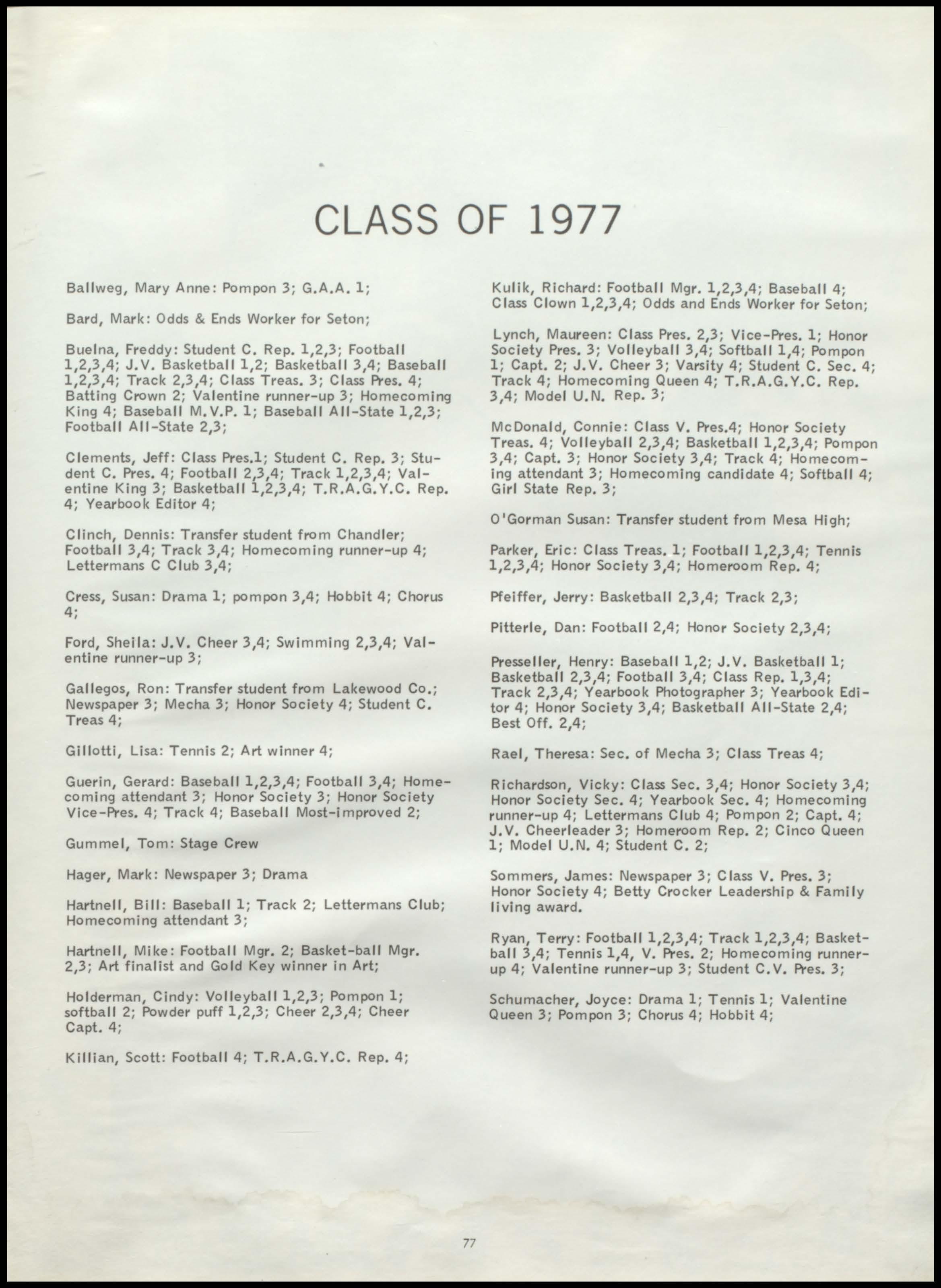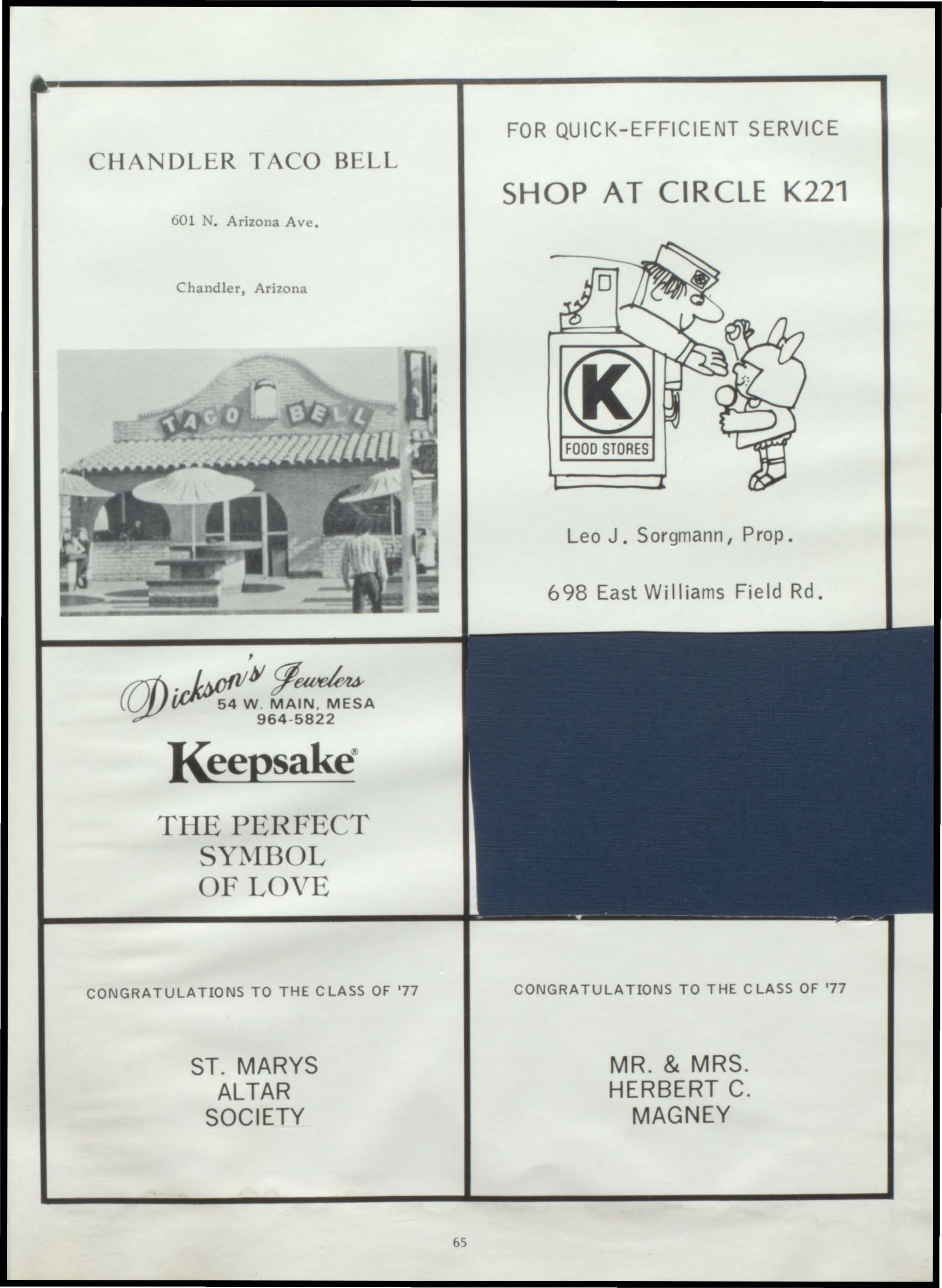 CHANDLER TACO B LL 601 N. Arizona Ave. Chandler 1 Arizona Keepsake THE PERFE T SYl\IBOL OF LOVE CONGRATULATIONS TO THE CLASS OF '77 ST. MARYS ALTAR SOCIETY 65 FOR QUICK-EFFICIENT SERVICE SHOP AT CIRCLE K221 FOOD STORES Leo J. Sorgmann, Prop. 698 East Williams Field Rd. CONGRATULATIONS TO THE CLASS OF '77 MR. & MRS. HERBERT C. MAG N EY