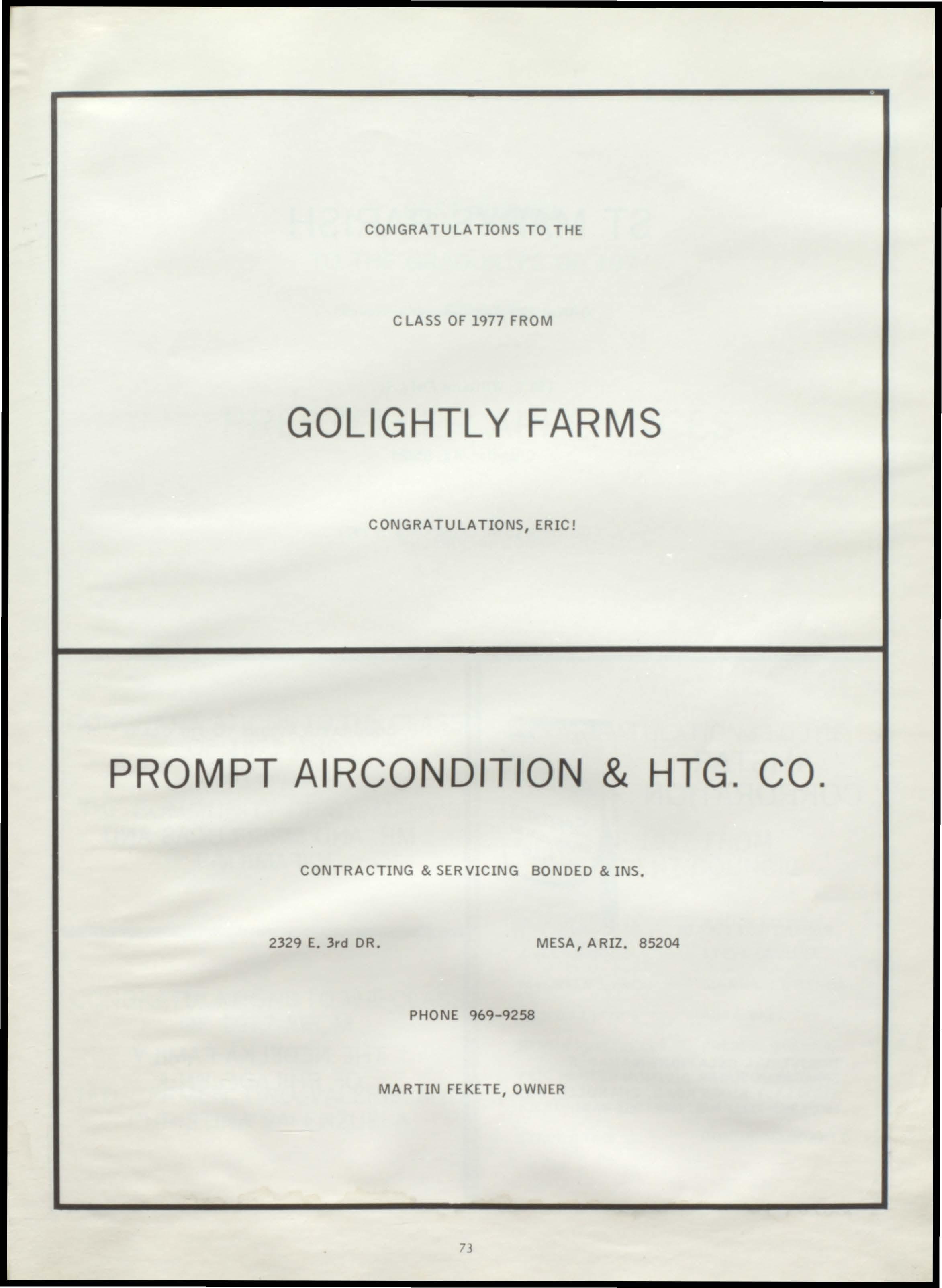 CONGRATULATIONS TO THE CLASS OF 1977 FROM GOLIGHT LY FAR MS CONGRATULATIONS, ERIC! PROMPT AIRCONDITION & HTG. CO. CONTRACTING & SERVICING BONDED & INS. 2329 E. 3rd DR. MESA, ARIZ. 85204 PHONE 969-9258 MARTIN FEKETE, OWNER 73