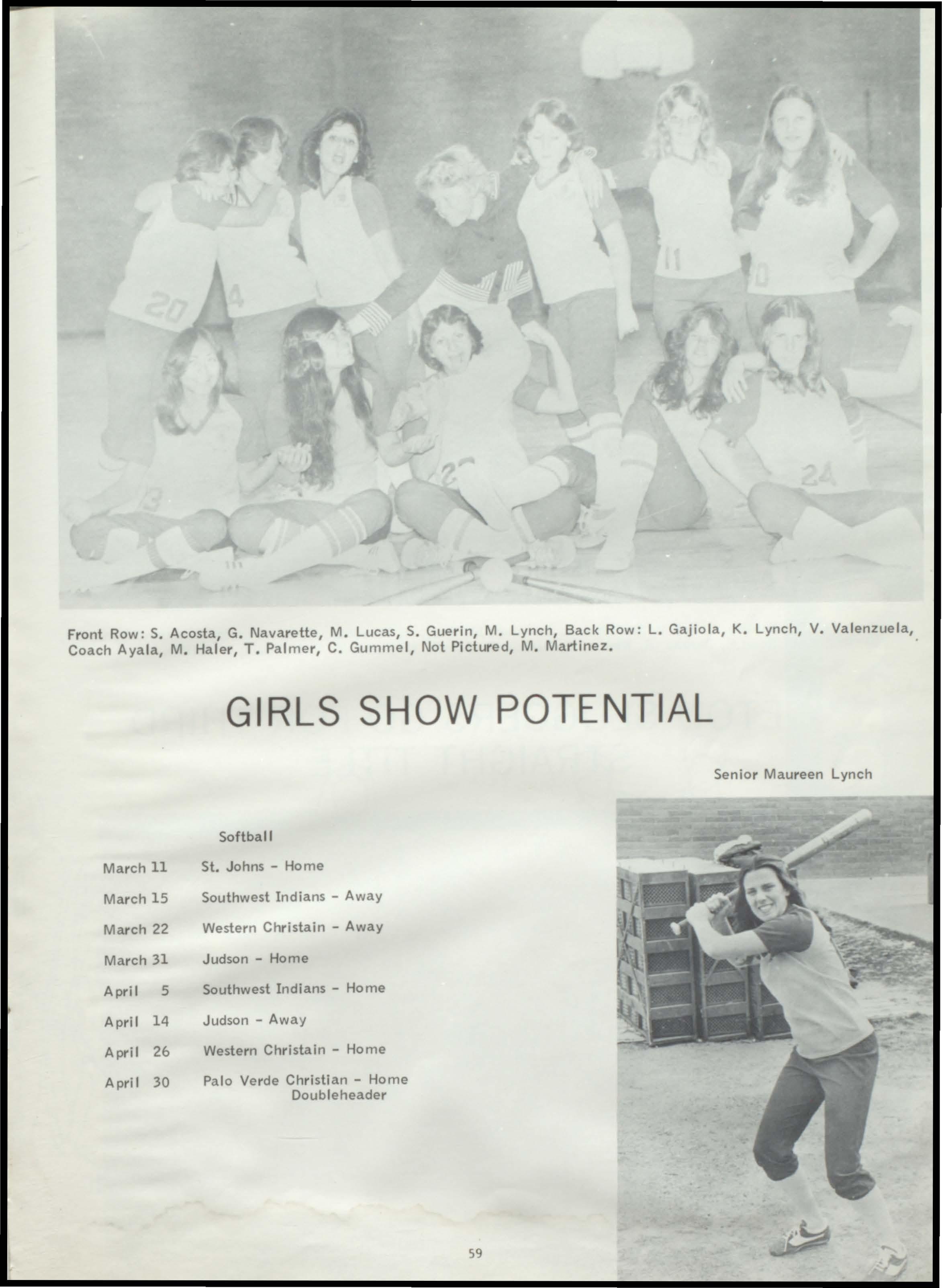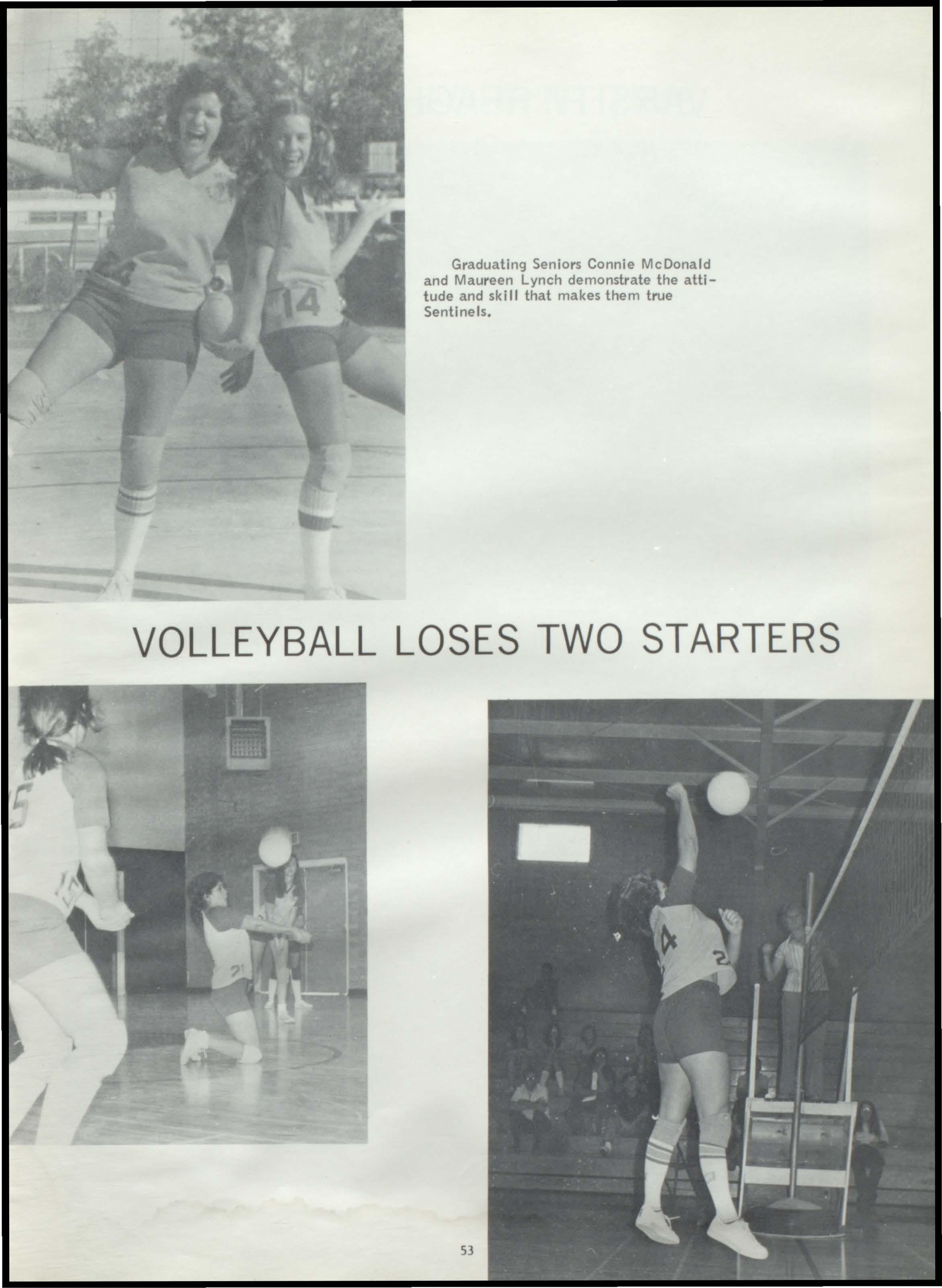 Lynch, Maureen: Class Pres. 2,3; Vice-Pres. 1; Honor Society Pres. 3; Volleyball 3,4; Softball 1,4; Pompon 1; Capt. 2; J. V. Cheer 3; Varsity 4; Student C. Sec. 4; Track 4; Homecoming Queen 4; T.R.A.G. Y.C. Rep. 3,4; Model U.N. Rep. 3;