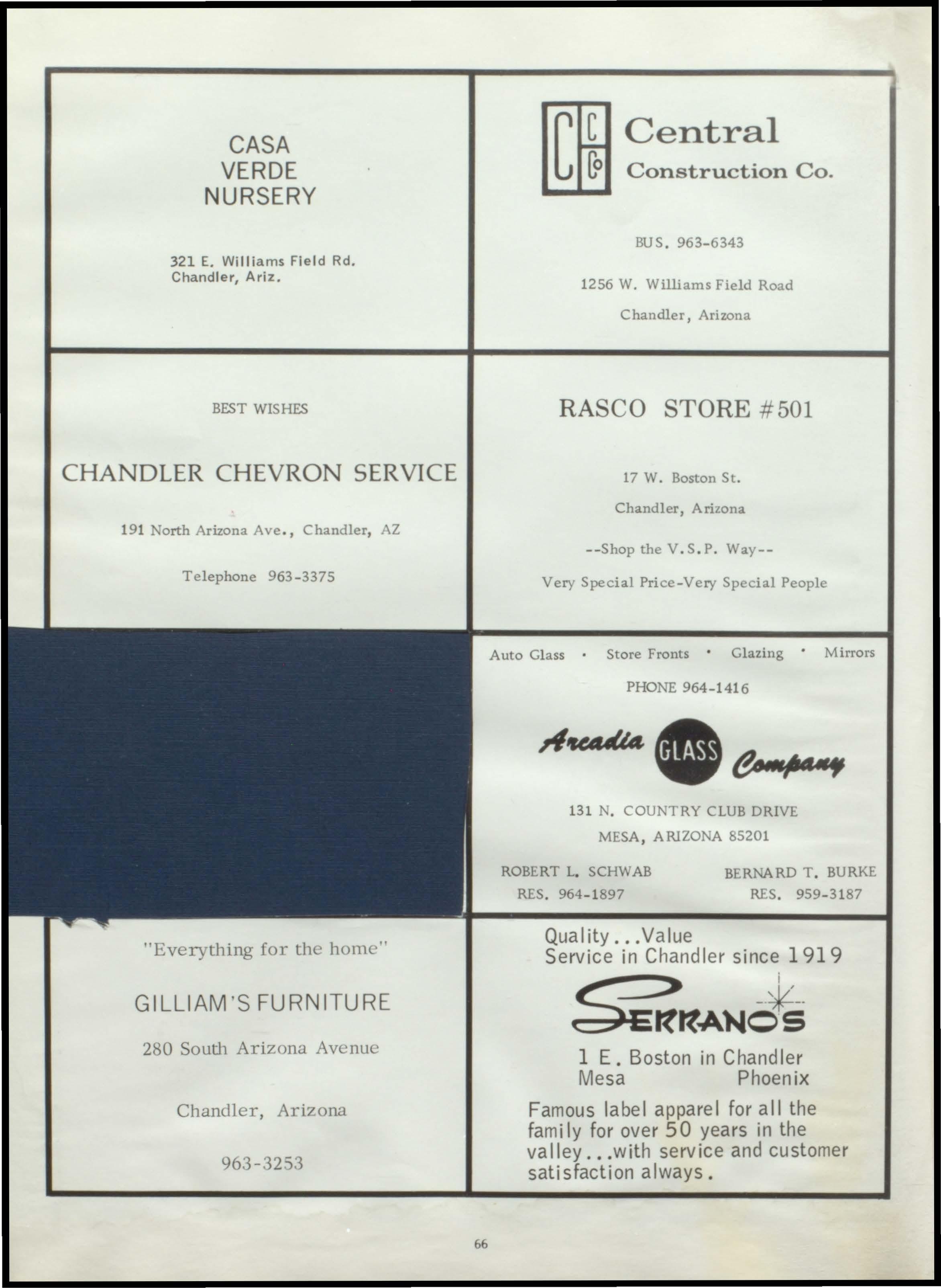 CASA VERDE NURSERY 321 E. Willia m s FJeld Rd. Chandler, Ari z. BEST WISHES CHANDLER CHEVRON SERVICE 1 9 1 North Arizona Ave . , Chandler, AZ Te l ep ho n e 9 6 3-3375 "Everyth i ng for t he home" GILLIAM'S FURNITURE 28 0 South Arizona Avenue Chandler , Ar i zona 66 Construction Co Ci Central BUS. 963-6343 1256 W. Williams Field Road Chandler, Arizona RASCO STORE # 501 17 W Boston St. Chandler, Arizona - - Shop the V S P Way-Very Speci al Price-Very Special People A u to Gl as s · Sto re Fro n t s • Glazi ng • M i rro rs PHONE 964-1 4 1 6 131 N COUNTRY C LU B D RIVE MESA , ARIZO A 85201 ROB ERT L. SC HWAB RES 96 4 -1 897 Quality ••• Value BE RNARD T BU RKE RES 9 59 - 3 187 Service in Chandl e r since 1919 1 E. Boston in Chandler Mesa Phoenix Famous label apparel for all the family for over 50 years in the valley .•• with service and customer satisfaction always.
