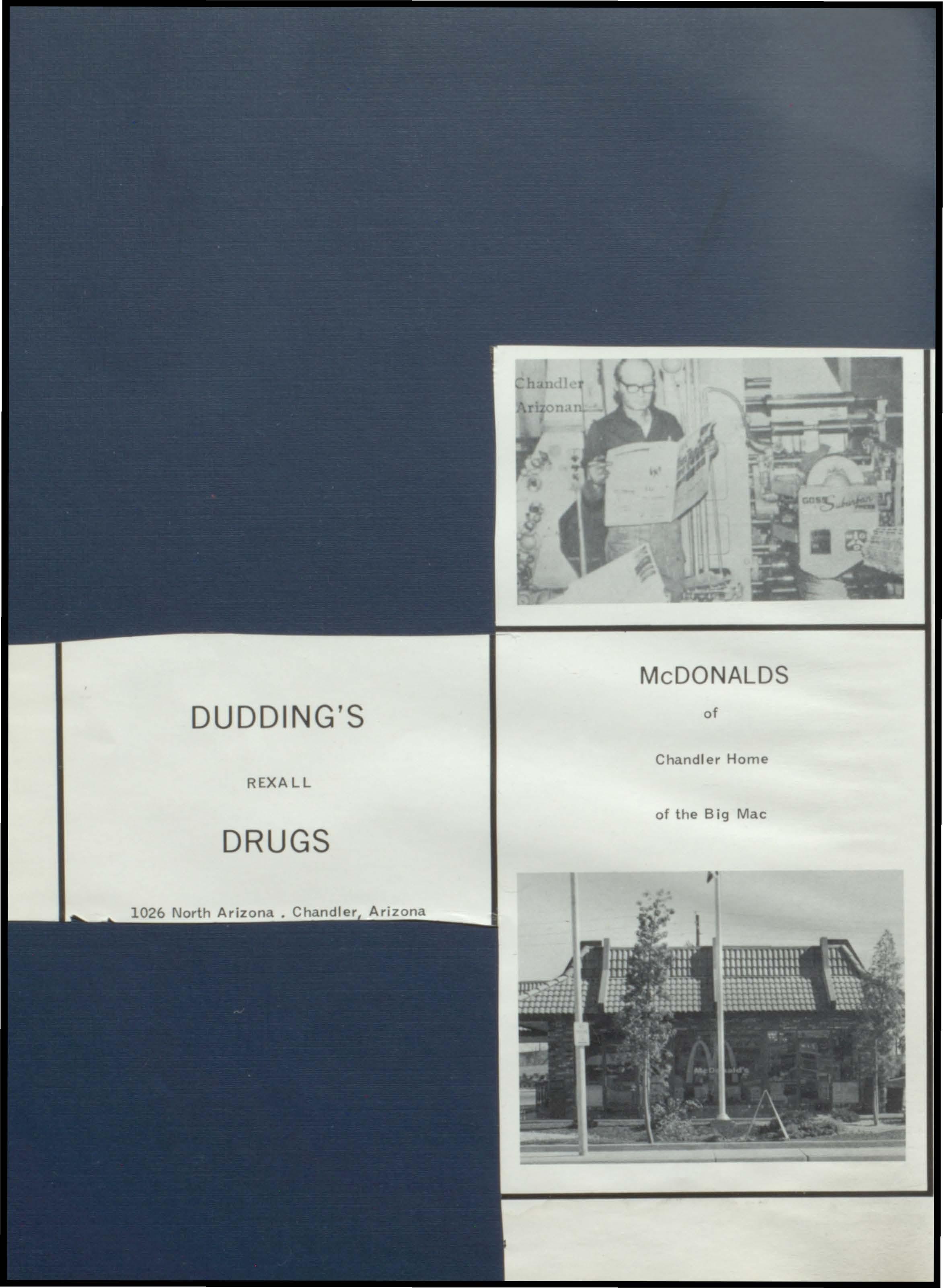 Phone 969-5581 LENHART HARDWARE HARDWARE, PAINT, PLUMBI.KG and ELECTRIC AL SUPPLIES KEN LENHART 101 W. MAIN ST. 44 \'\EST 1st A VENUE \1ESA, 85202 MESA, ARIZ. 85201 PHONE 964-5679 DAVID J. DUCKWORTH JOHN V. MARTINEZ REGISTERED PHARMACISTS HOURS- 8 A.M. TO 8 P.M. MON. -FRI. 8 A.M. fO 7 P.M. ON SAT. &7 RESTAURANT CARRY-OUT " MOR E LI KE IT" SPECIALIZING IN COMPLETE CATERING SERVICE 672 N. ARIZONA AVE. CHANDLER, ARIZ. 85224 PHONE: 963-6357 CY & EILEEN EDWARDS Give us A Rfng 963-4069 58 S. San i\1arcos Pl. Chandler OFFICE SUPPLIES \ 'D GIFTS FOR BUSINESS \1 'D .-I0\.1E.