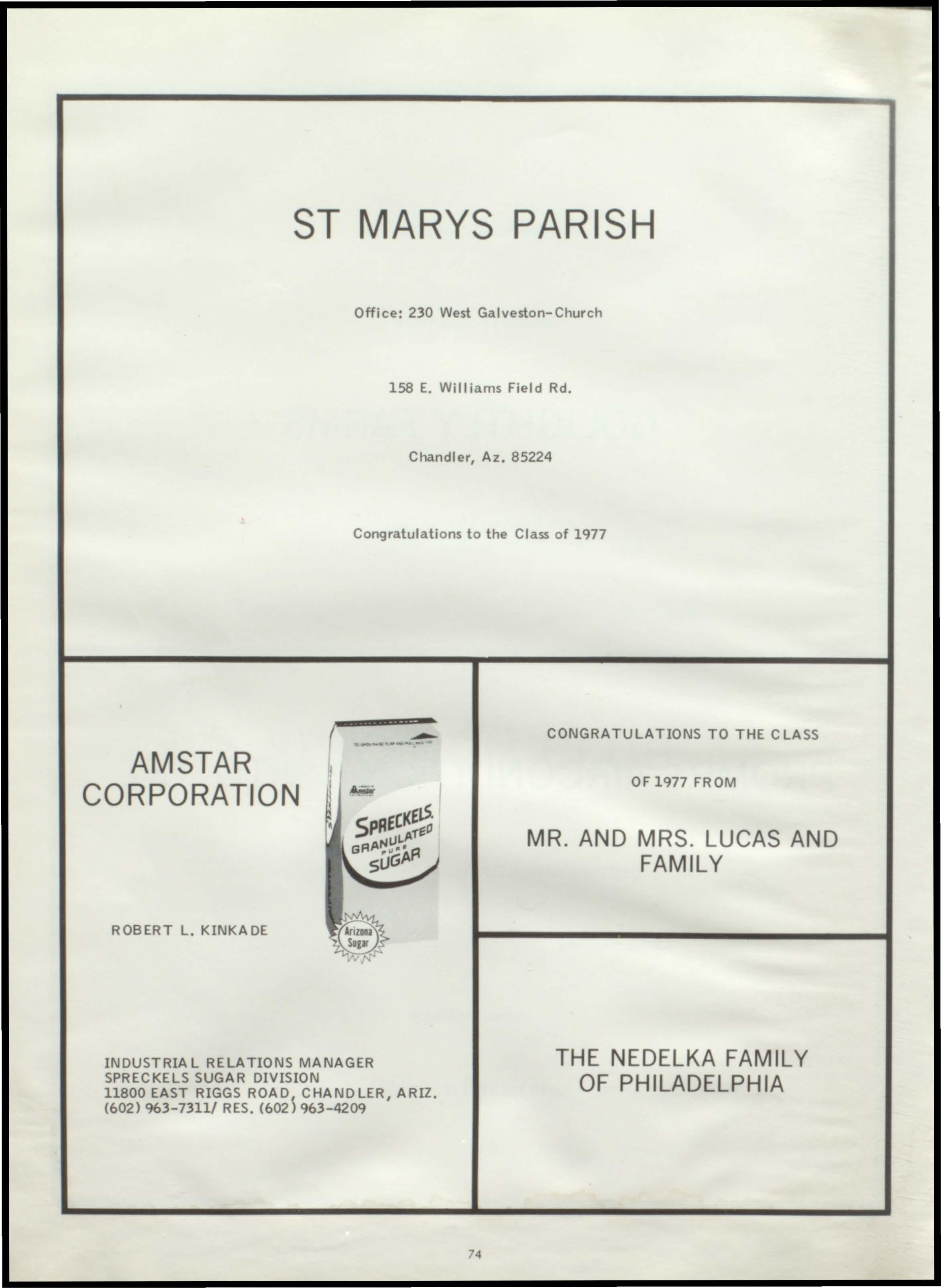 ST MARYS PARISH Office: 230 West Galveston-Church 158 E. Williams Field Rd. Chandler, Az. 85224 Congratulations to the Class of 1977 AM STAR CORPORATION (ROBERT L. KINKADE Amoni '11::sorar tt' INDUSTRIAL RELATIONS MANAGER SPRECKELS SUGAR DIVISION 11800 EAST RIGGS ROAD, CHANDLER, ARIZ. (602) 963-7311/ RES. (602) 963-4209 74 CONGRATULATIONS TO THE CLASS OF1977 FROM MR. AND MRS. LUCAS AND FAMILY THE NEDELKA FAMILY OF PHILADELPHIA