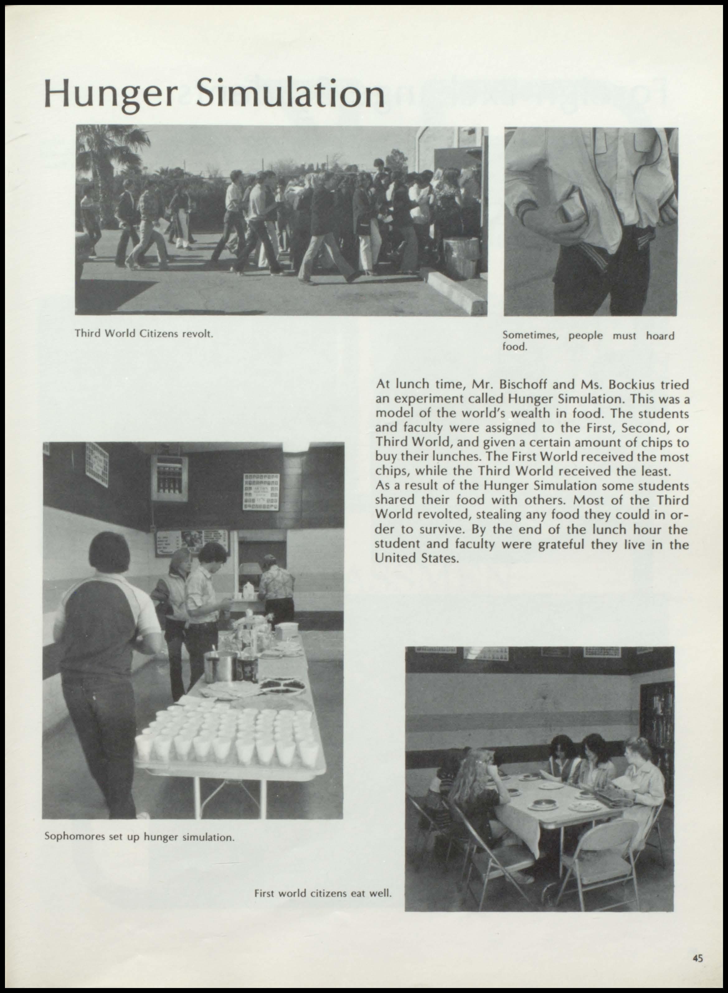 Third World Cit1zens revolt. Sophomores set up hunger simulation. Sometimes, people must hoard food.