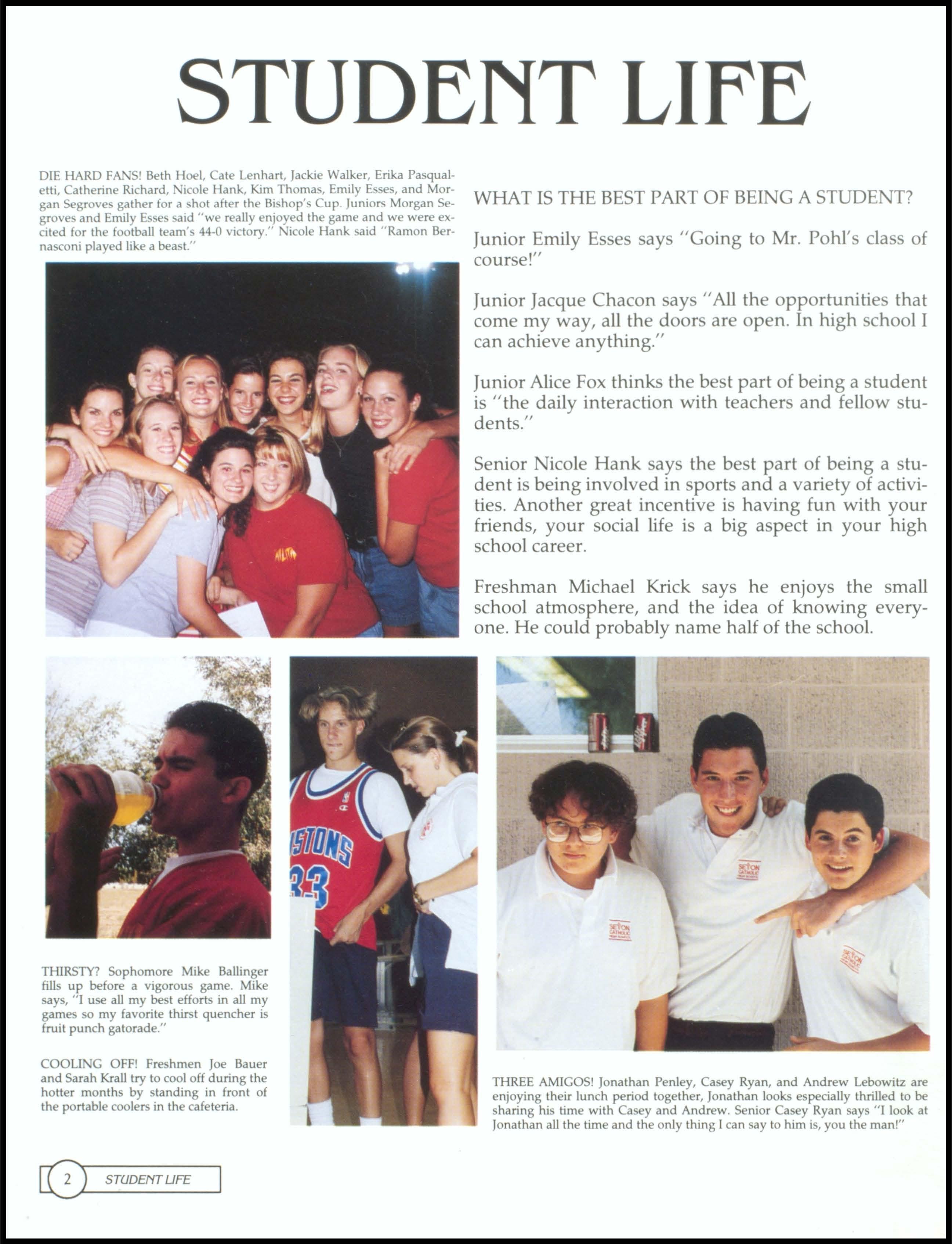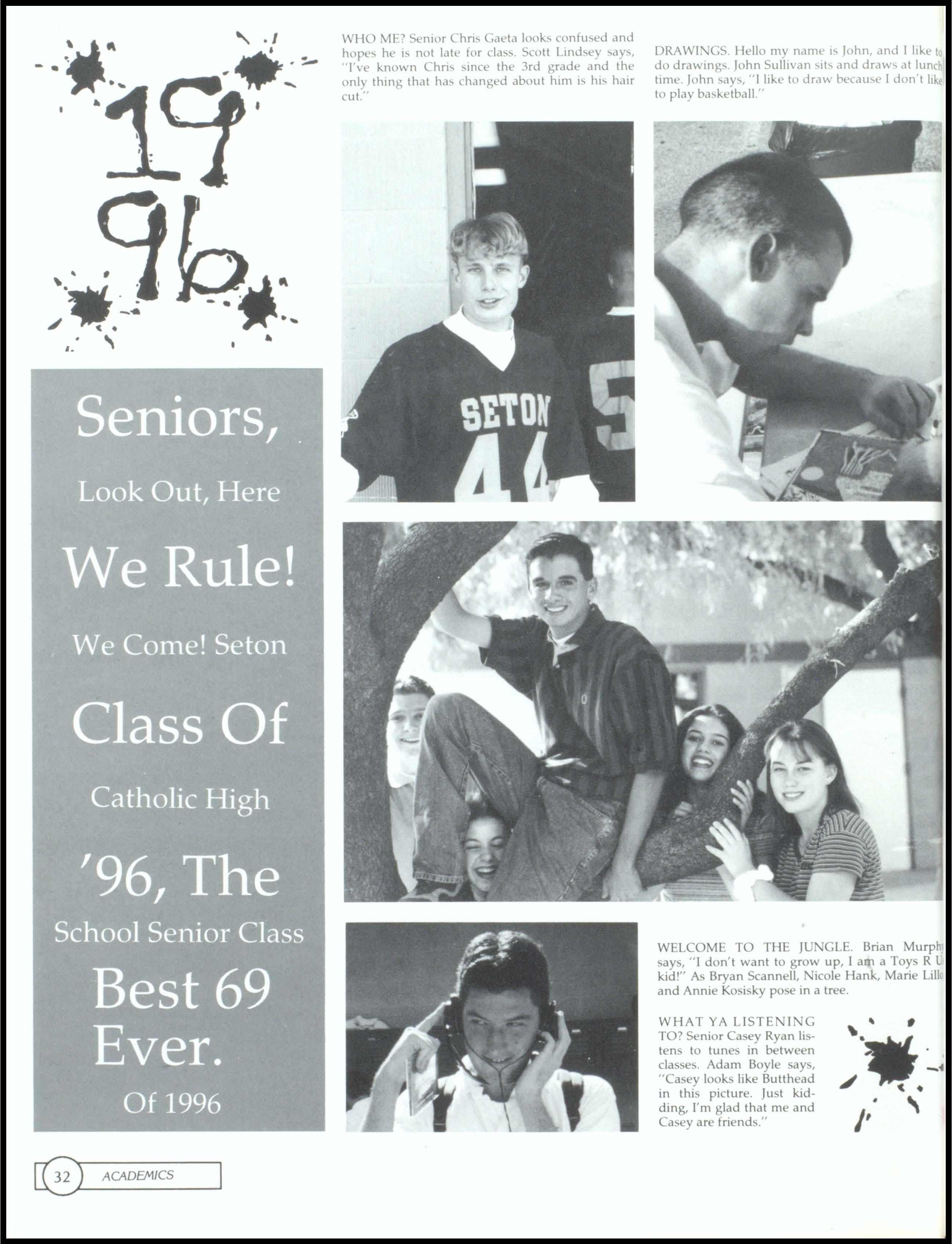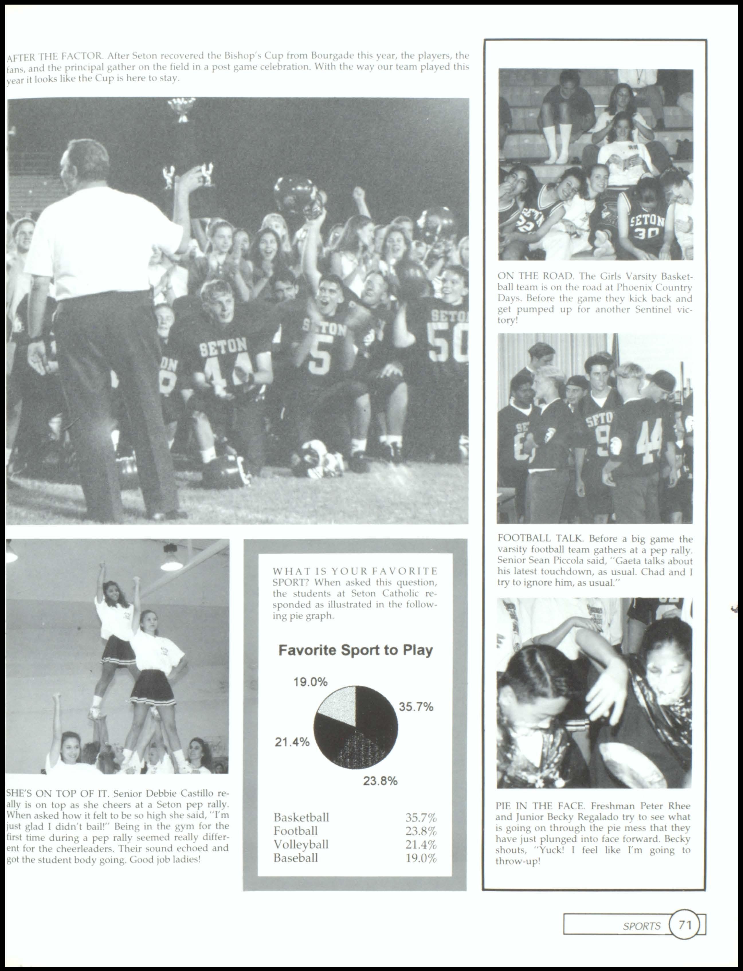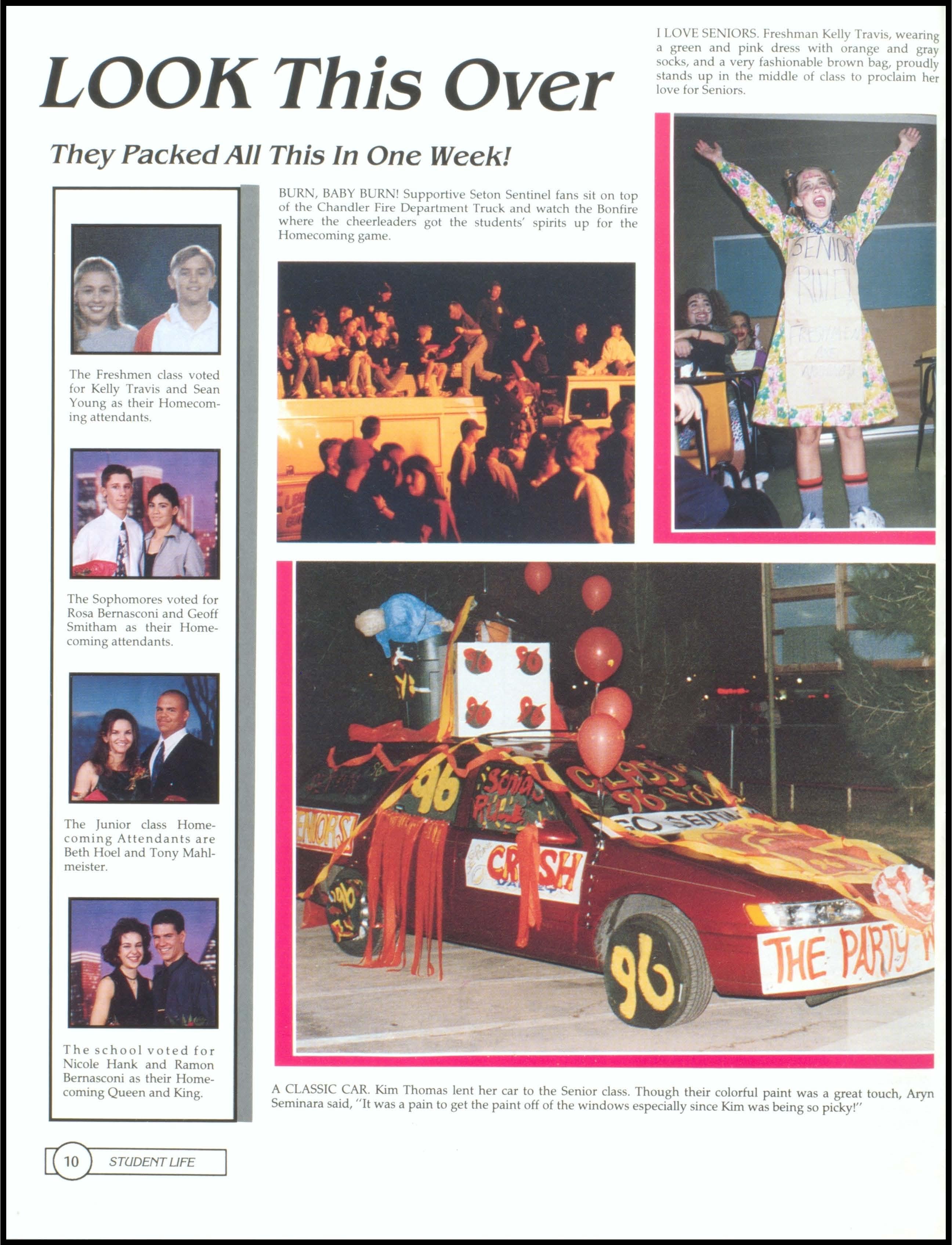 LOVE SENIORS. Freshman Kelly Travis, wearing a green and pink dress with orange and gray socks, and a very fashionable brown bag, proudly stands up in the middle of class to proclaim her love for Seniors. Freshmen class voted for Kelly Travis and Sean Young as their Homecoming attendants. Sophomores voted for Rosa Bernasconi and Geoff Smitham as their Homecoming attendants. The Junior class Homecoming Attendants are Beth Hoel and Tony Mahlmeister. The school voted for icoie Hank and Ramon Bernasconi as their Homecoming Queen and King.1, 2, SENIORS WE RULE! The Seton Football team geh motivated at the pep rally prior to the Homecoming game where they beat Valley and made II to state! The Senior Football players will be missed.