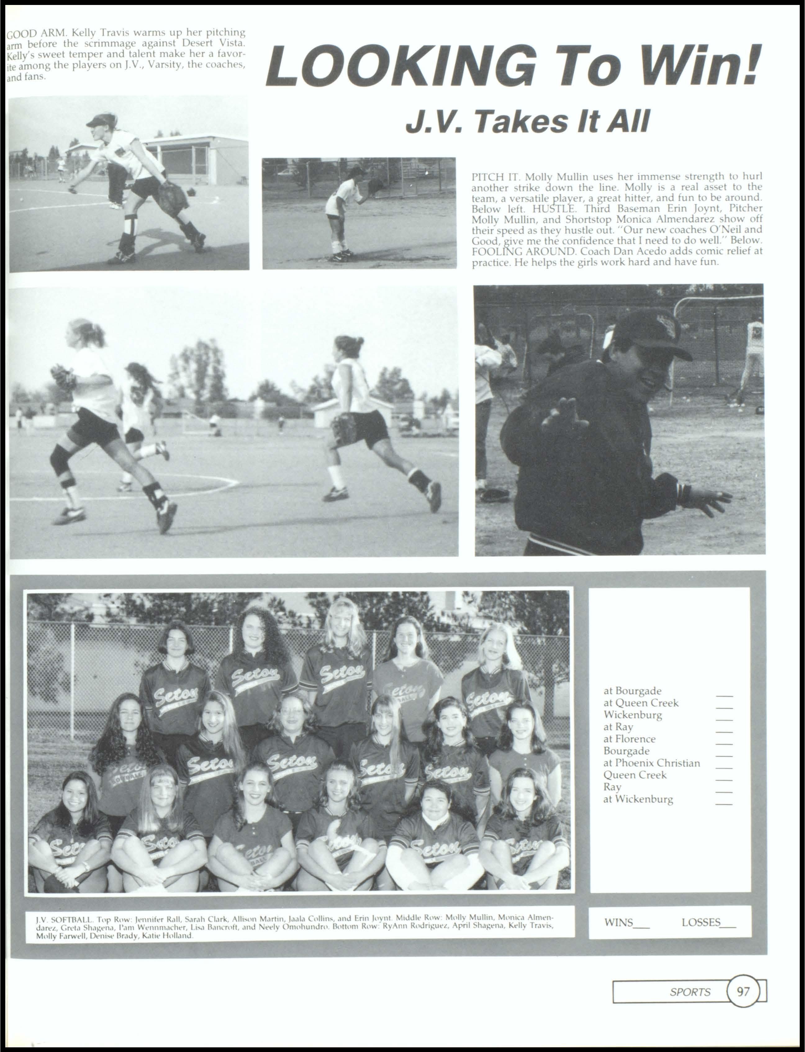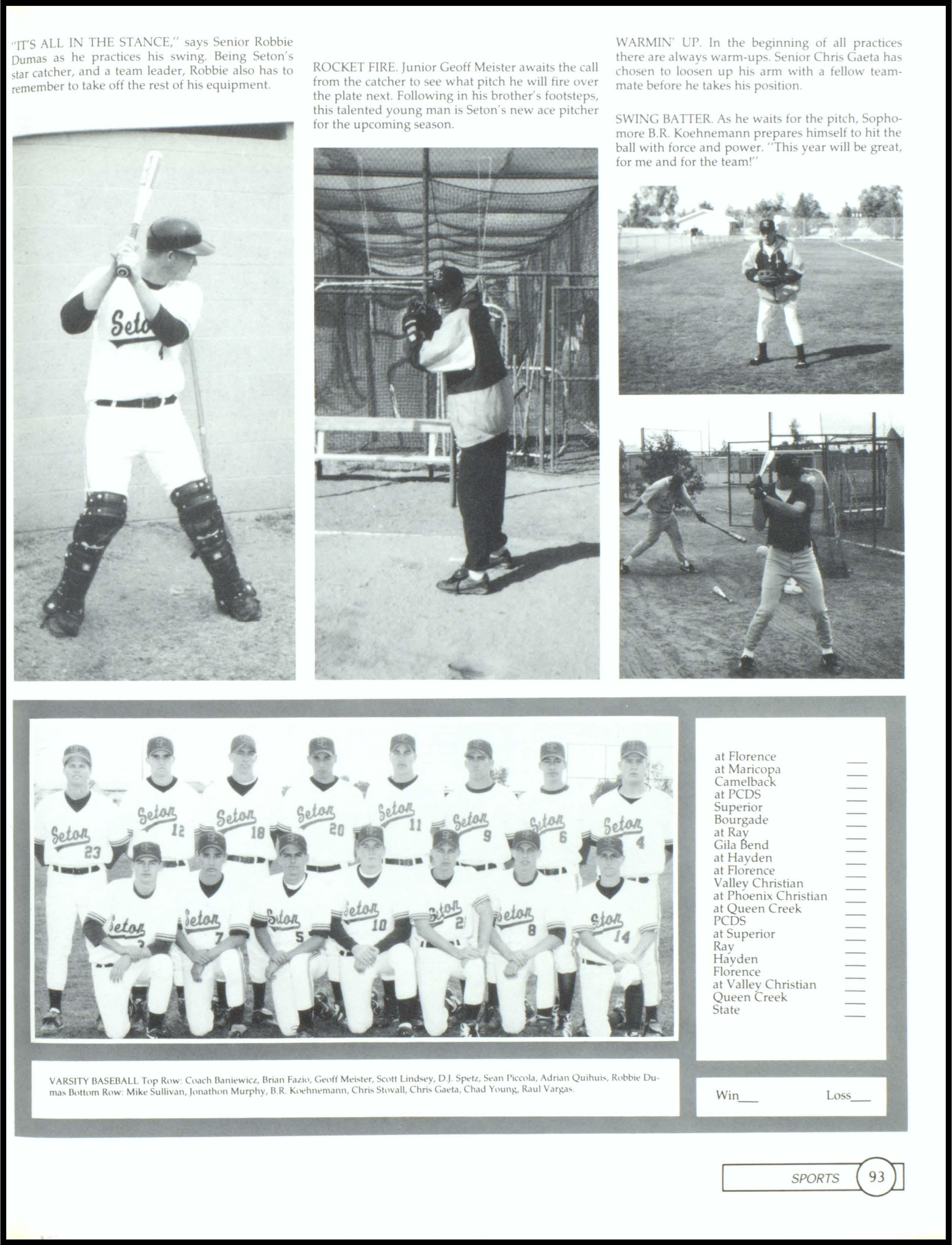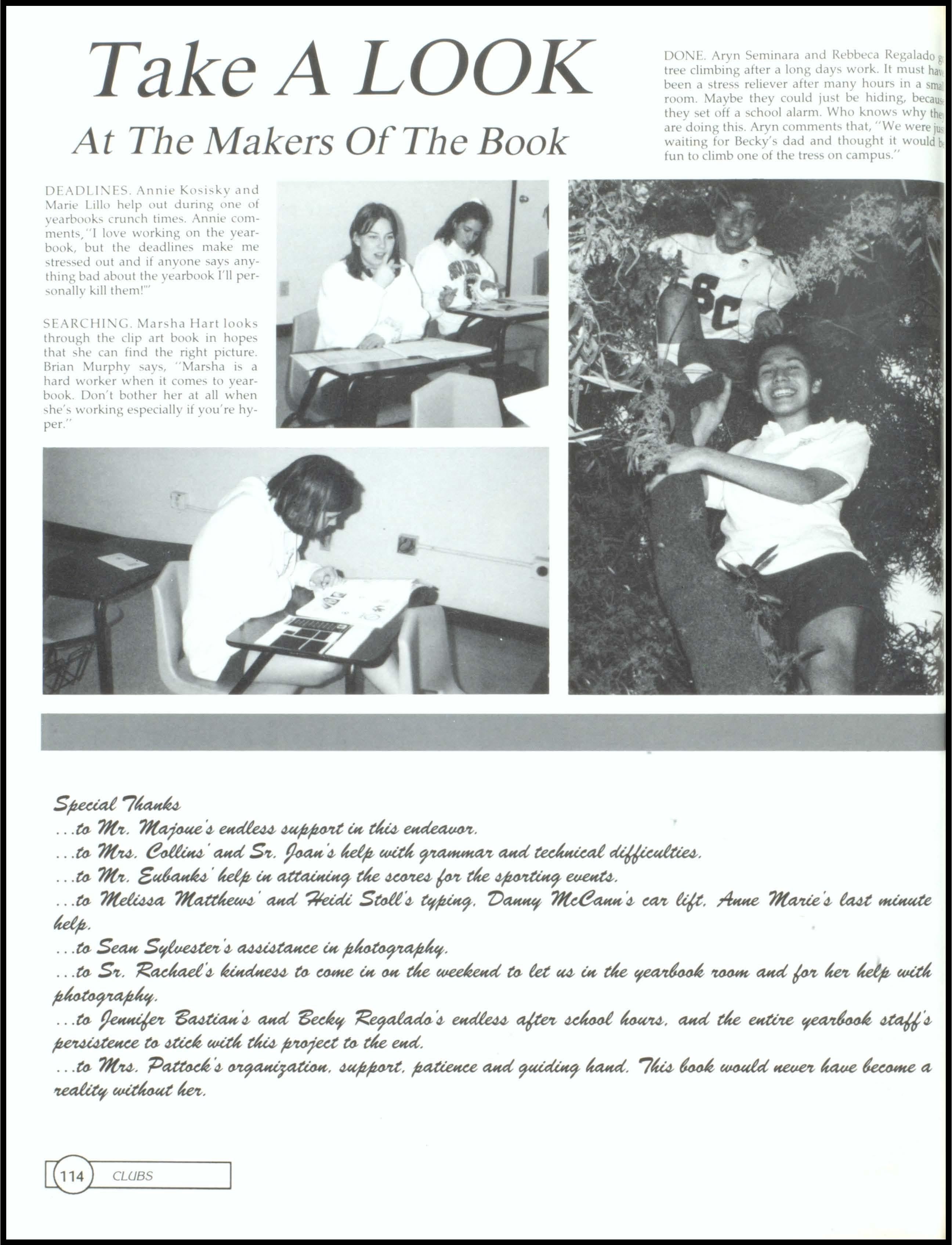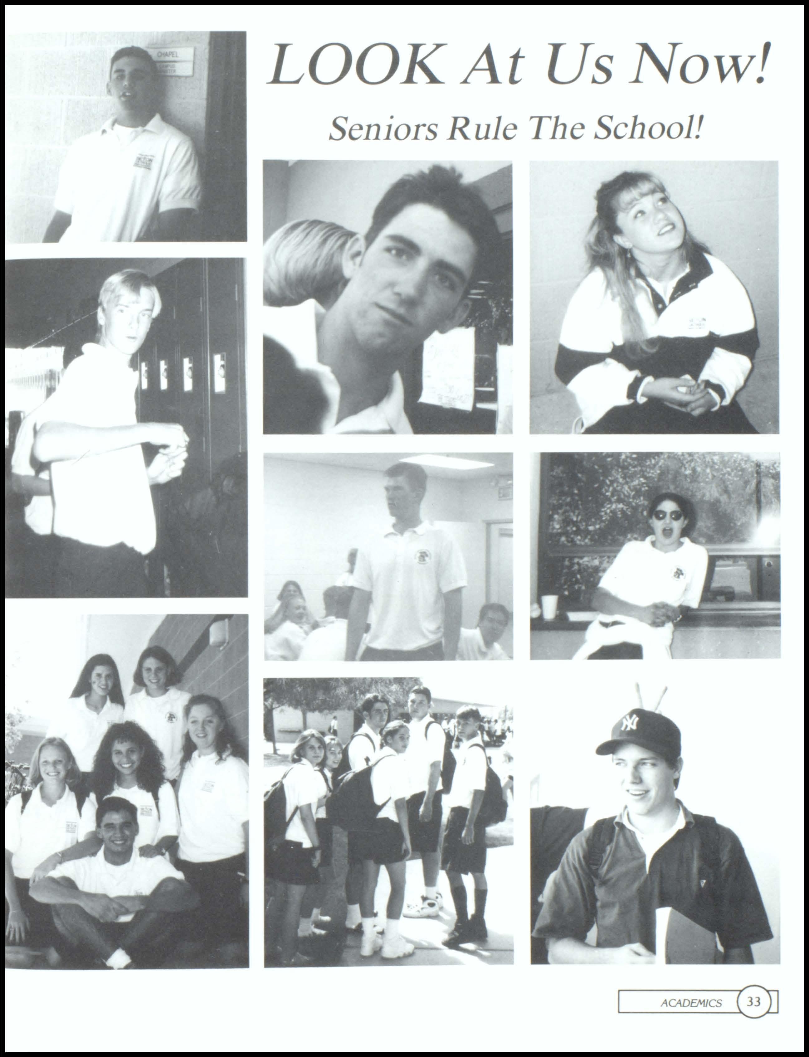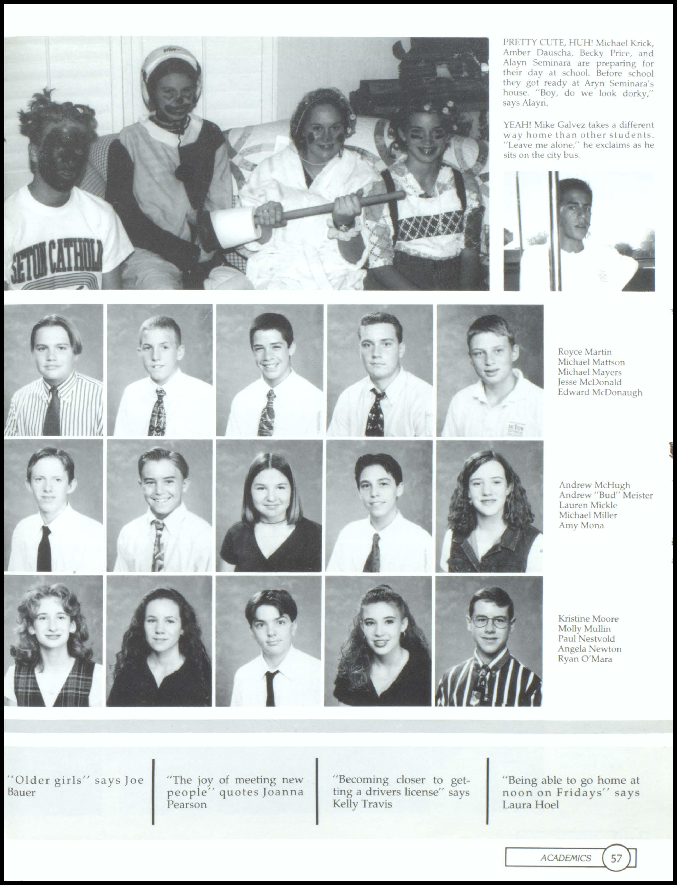 LOVE SENIORS. Freshman Kelly Travis, wearing a green and pink dress with orange and gray socks, and a very fashionable brown bag, proudly stands up in the middle of class to proclaim her love for Seniors. Freshmen class voted for Kelly Travis and Sean Young as their Homecoming attendants. Sophomores voted for Rosa Bernasconi and Geoff Smitham as their Homecoming attendants. The Junior class Homecoming Attendants are Beth Hoel and Tony Mahlmeister. The school voted for icoie Hank and Ramon Bernasconi as their Homecoming Queen and King.1, 2, SENIORS WE RULE! The Seton Football team geh motivated at the pep rally prior to the Homecoming game where they beat Valley and made II to state! The Senior Football players will be missed.