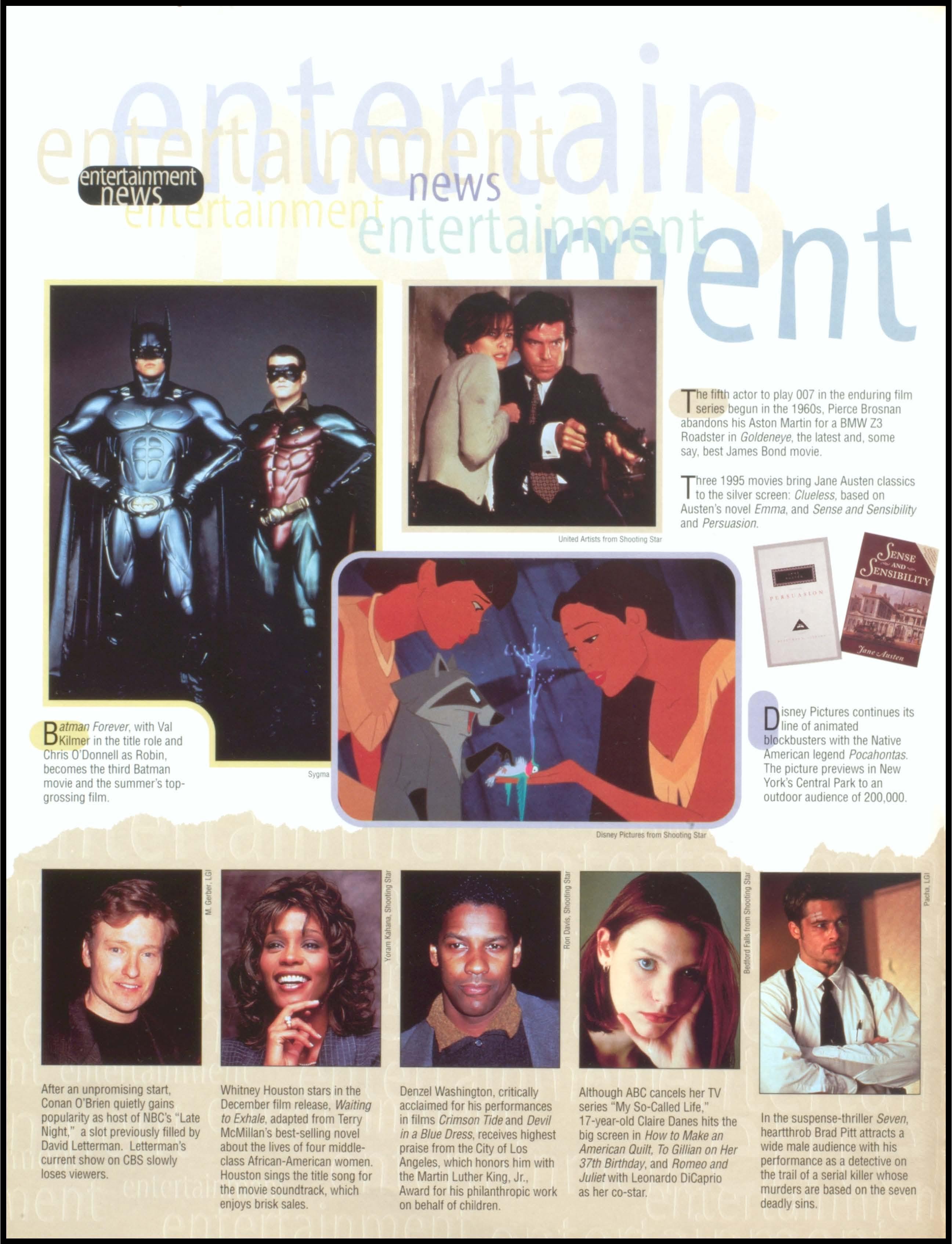 Batman Forever, w1th Val Kilme r in the IItie role and Chris O'Donnell as Robin , becomes the th1rd Batman movie and the summer's topgrossing film Disney PiCIUres trom Shooti"'' St.trNBC's hospttal drama ·E. R conttnues to draw high ratmgs throughout 1995 thanks to tis dramattc realism and the appeal of handsome George Clooney (middle nght), supermodel Ctndy Crawford's latest date