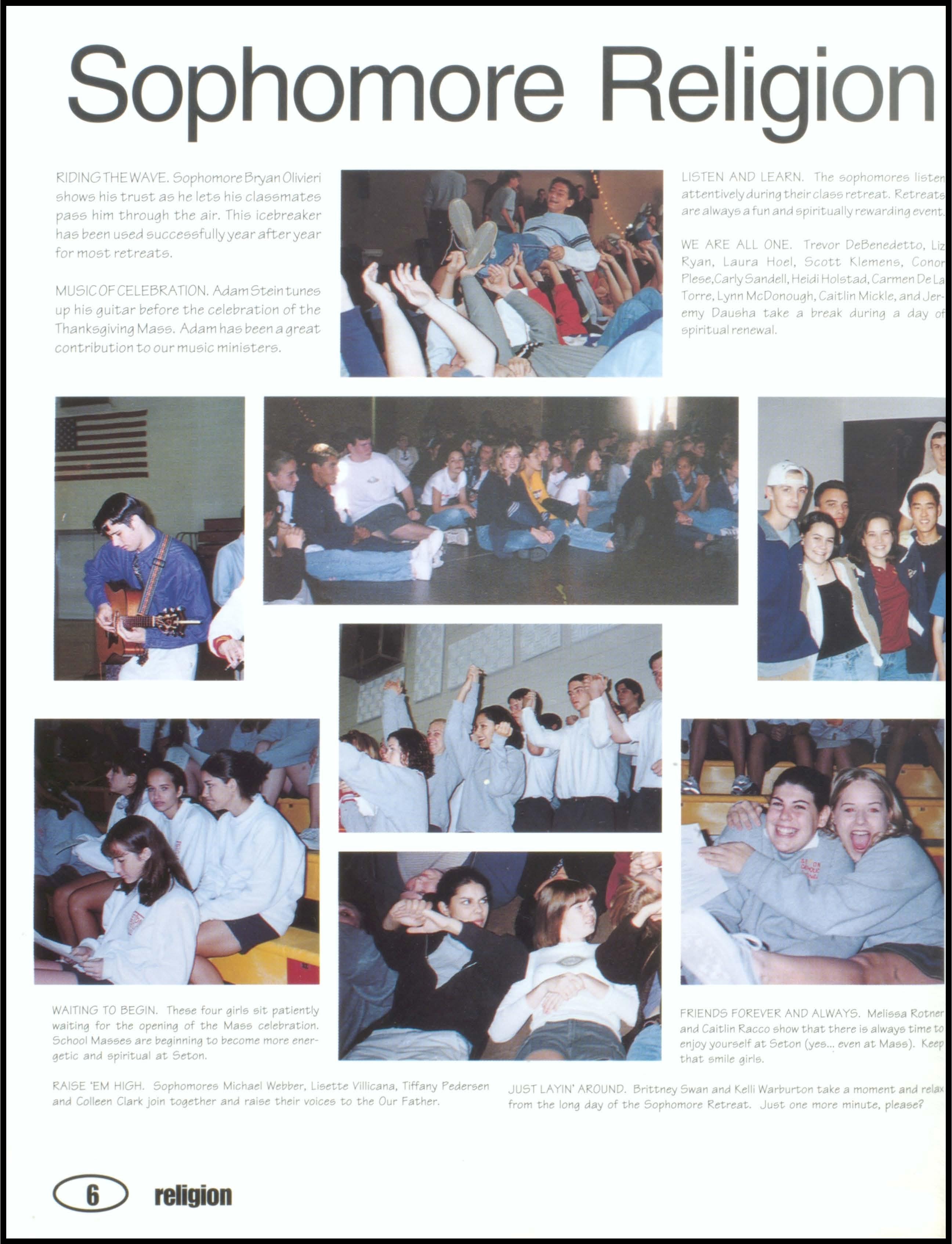 The Freshman at retreat deco rated White t-shwts a5 &ometh•ng to symbo rze themselves and to remember the retreat. Fresh man CartJirna f .a5 5 bu5rly working to perfect her ce breakers are often the most exc ting and best remembered part of the retreat& C ad Boatner. Chr 5 Miler, and Steve ovak wor together to c;;tand up as fast as they can "th n ed arm<;. E:ach group had to come together and work as one to wrn the cebrea er "'hl5 ft rn Wlth the •dea of community and wor rng togl"ther as one at Seton.IDI G THE WAVE. Sophomore Bryan Oliv1eri shows h1s trust as he lets his classmates pass him through the air. Th s icebreaker has been used successfully year after year for most retreats.
