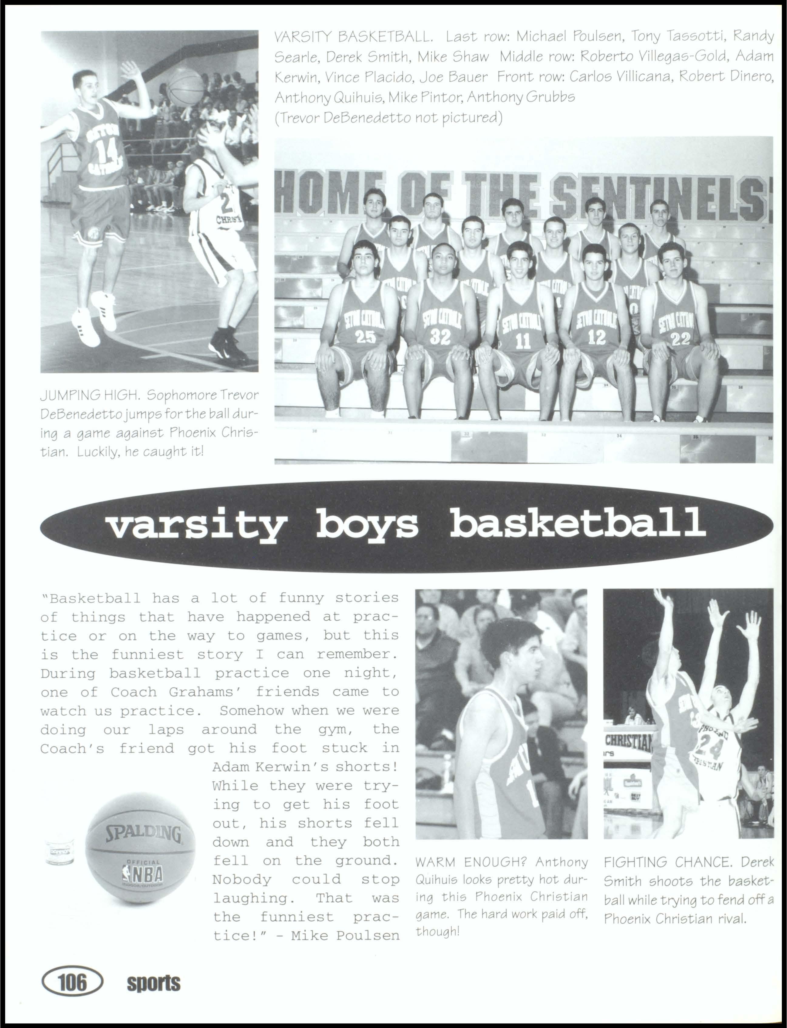 Hockey At Seton? That's what their jerseys say. Actually they say "SCHS", but the point is that Seton finally picked up the skates after years of planning and deliberation Three years to be exact! In their freshmen year, Juniors Thomas Abraham and Andy Urban brought the idea up to Mr. Eubanks and were told there was no money in the budget for it, and to remind him next year. They were met with the same answer the following two years before they took matters into their own hands They found players and formed it as a club . All the teammates would pay for equipment soons and the league fee for Chandler Sports Spectrum. Now with Coach Myskowski, Captain Scott Ferris, and Assistant Captains Andy Urban and Thomas Abraham, the team is the only non-SA school in the league. Will the team be around next year? The answer, according to Andy, is an emphatic "YES WE WILL!"