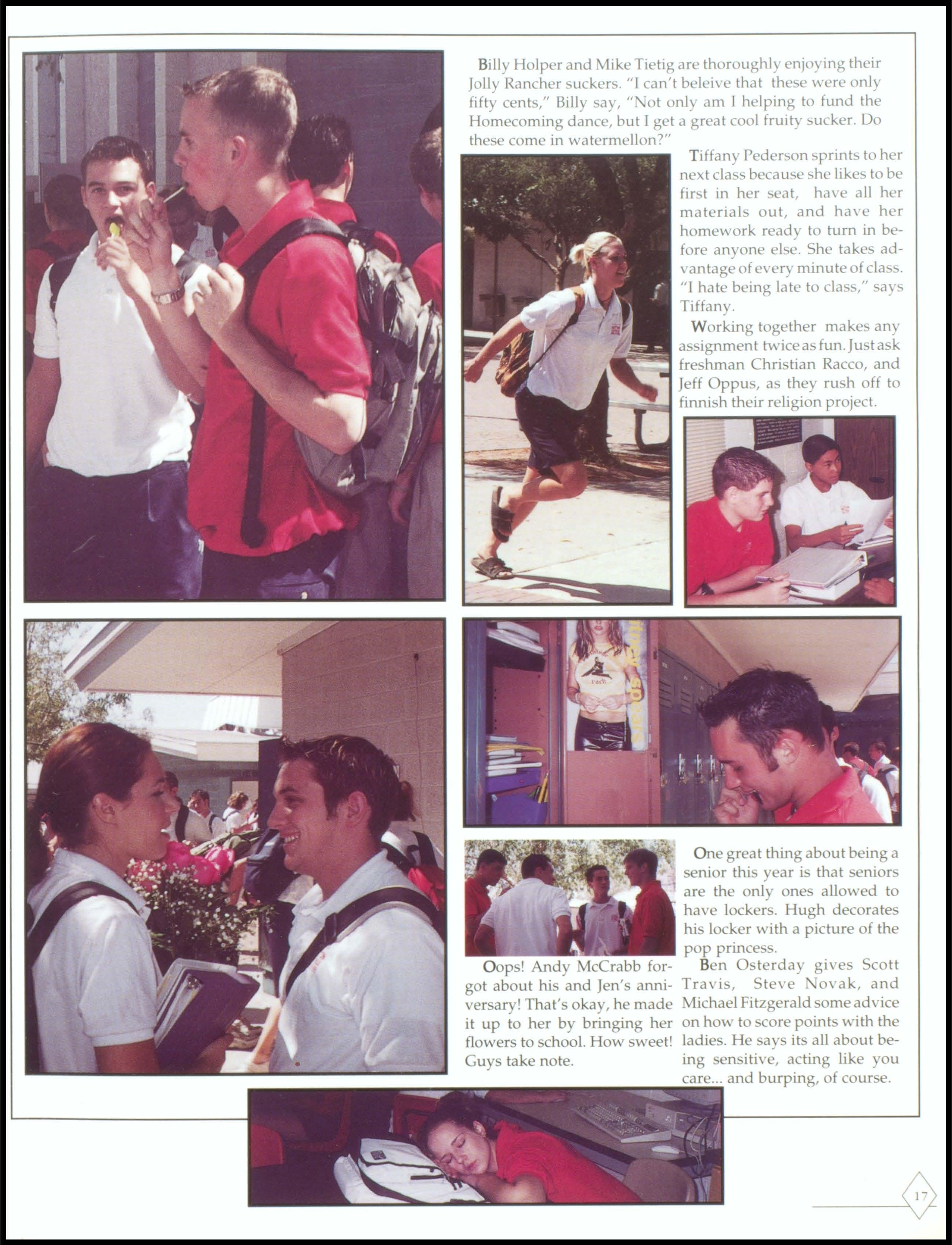 One great thing about b ing a nior thi year i that enior are the only one allowed to have lockers. Hugh decorates his locker with a picture of the pop prince Ben 0 terday gives cott Travi , tev ovak, and Michael Fitzgerald orne advice on how to cor point with the ladie . He ay its all about being ensitive, acting lik you car ... and burping, of cour e.