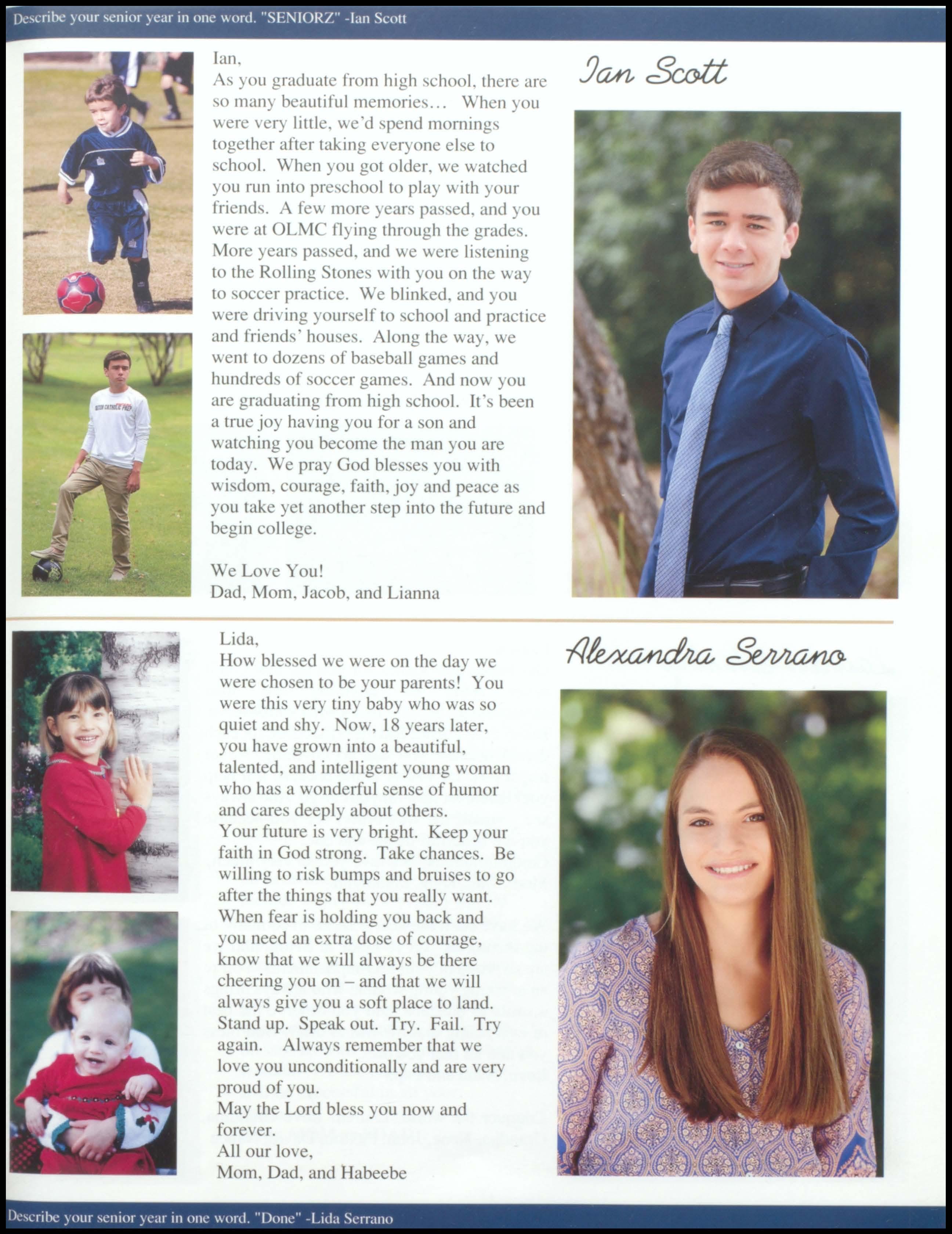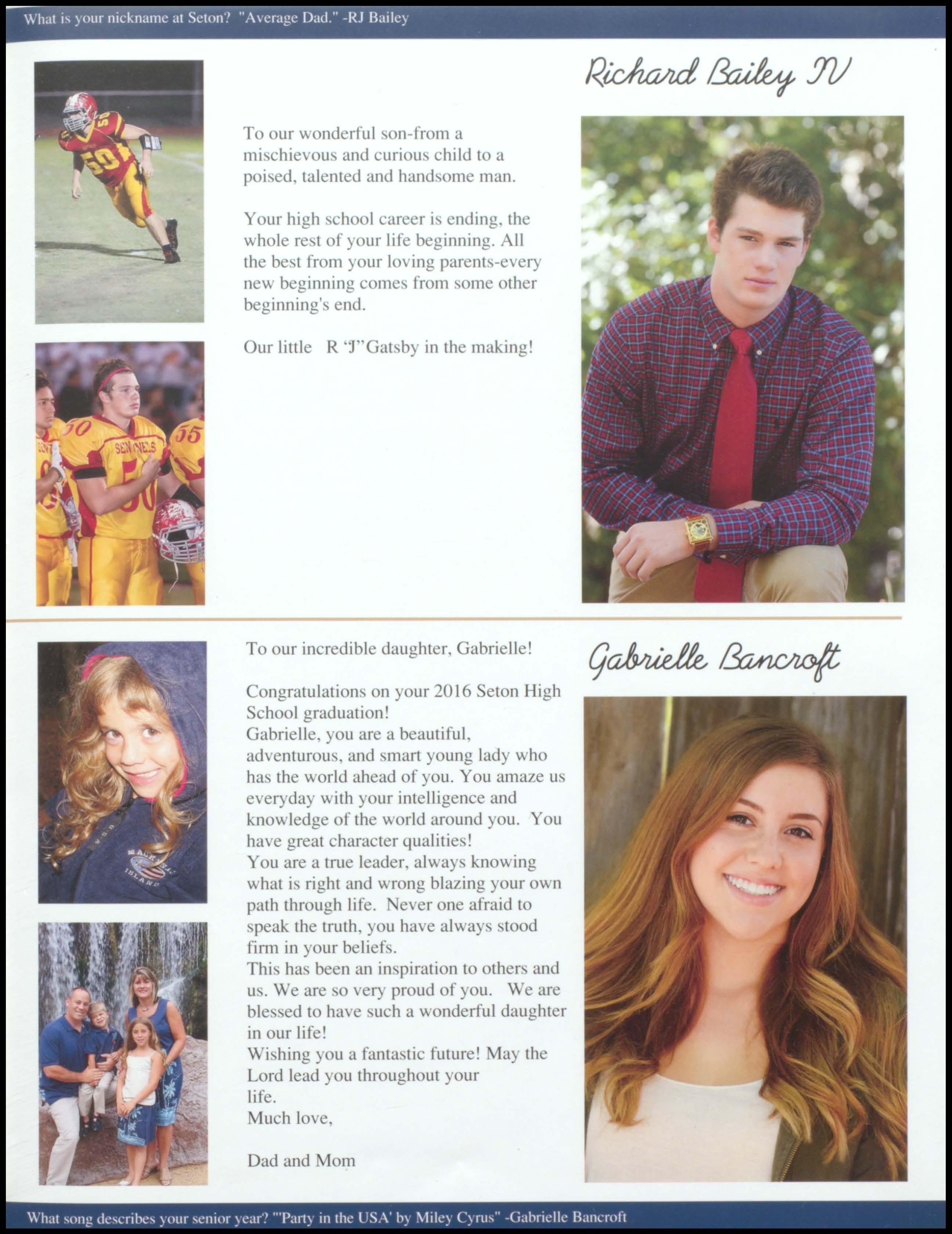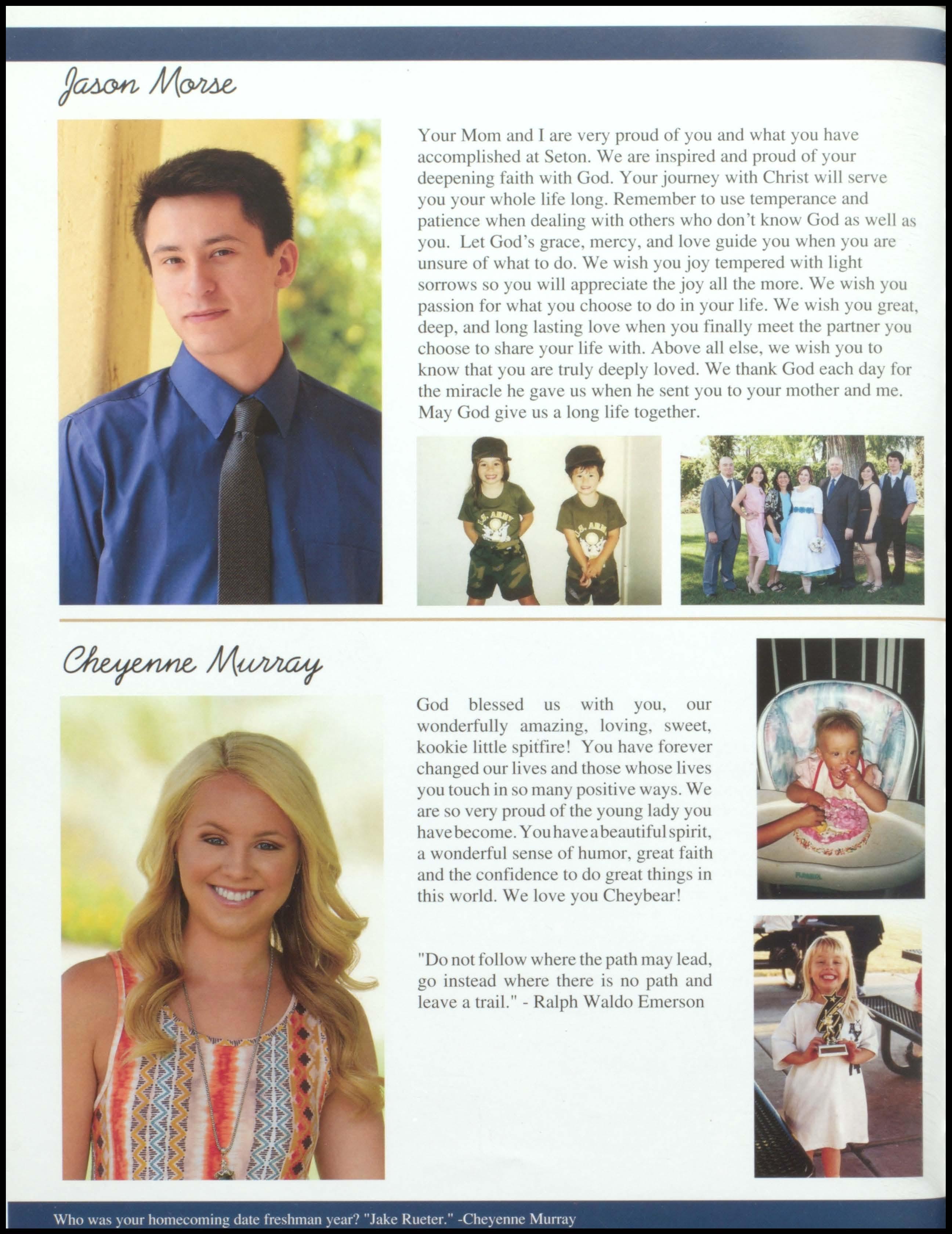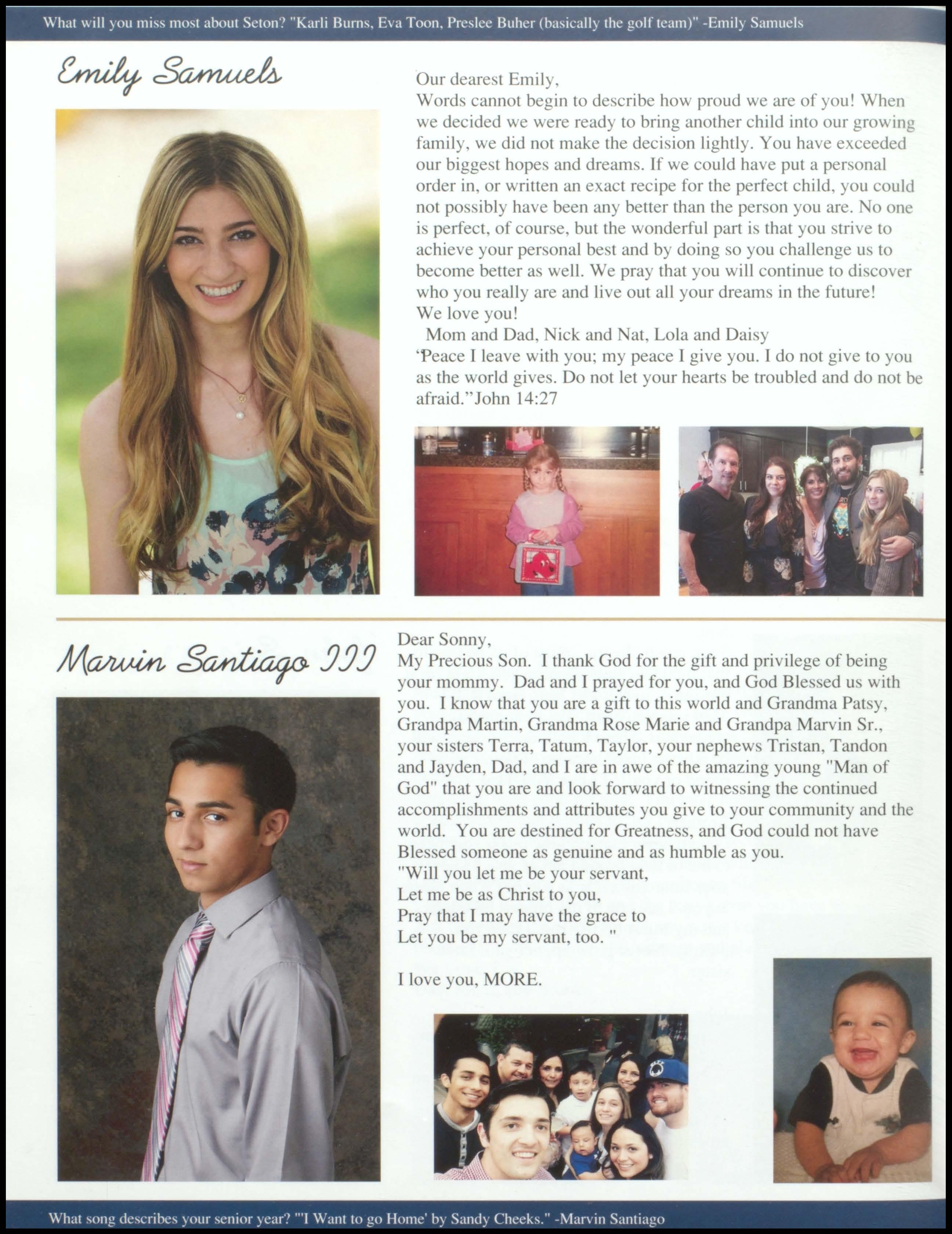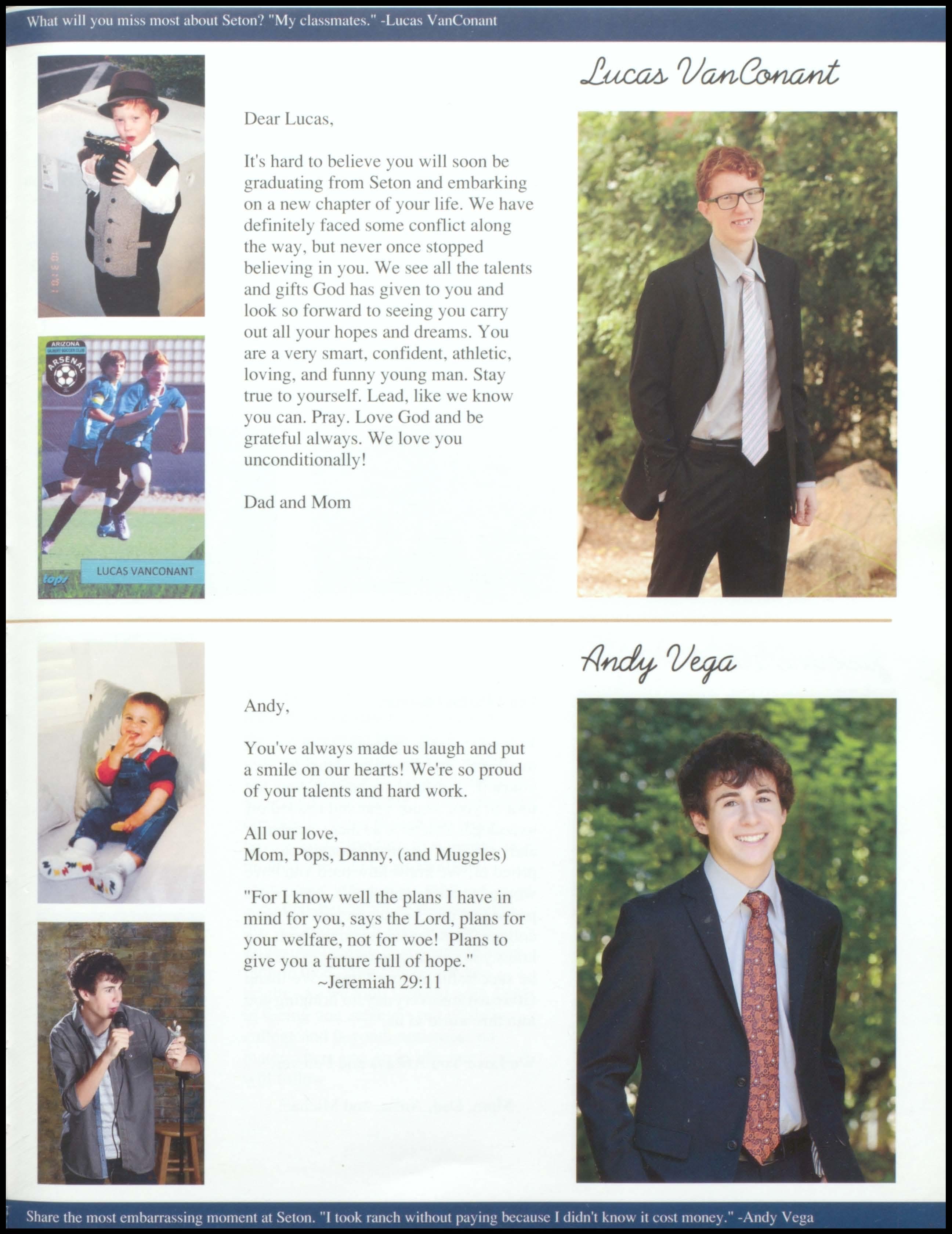 It's hard to believe you will soon be graduating from Seton and embarking on a new chapter of your life. We have definitely faced orne conflict along the way, but never once stopped believing in you. We see all the talents and gifts God has given to you and look so forward to . eeing you carry out all your hopes and dreams. You are a very smart, confident, athletic, loving, and funny young man. Stay true to your elf. Lead, like we know you can. Pray. Love God and be grateful always. We love you unconditionally!
