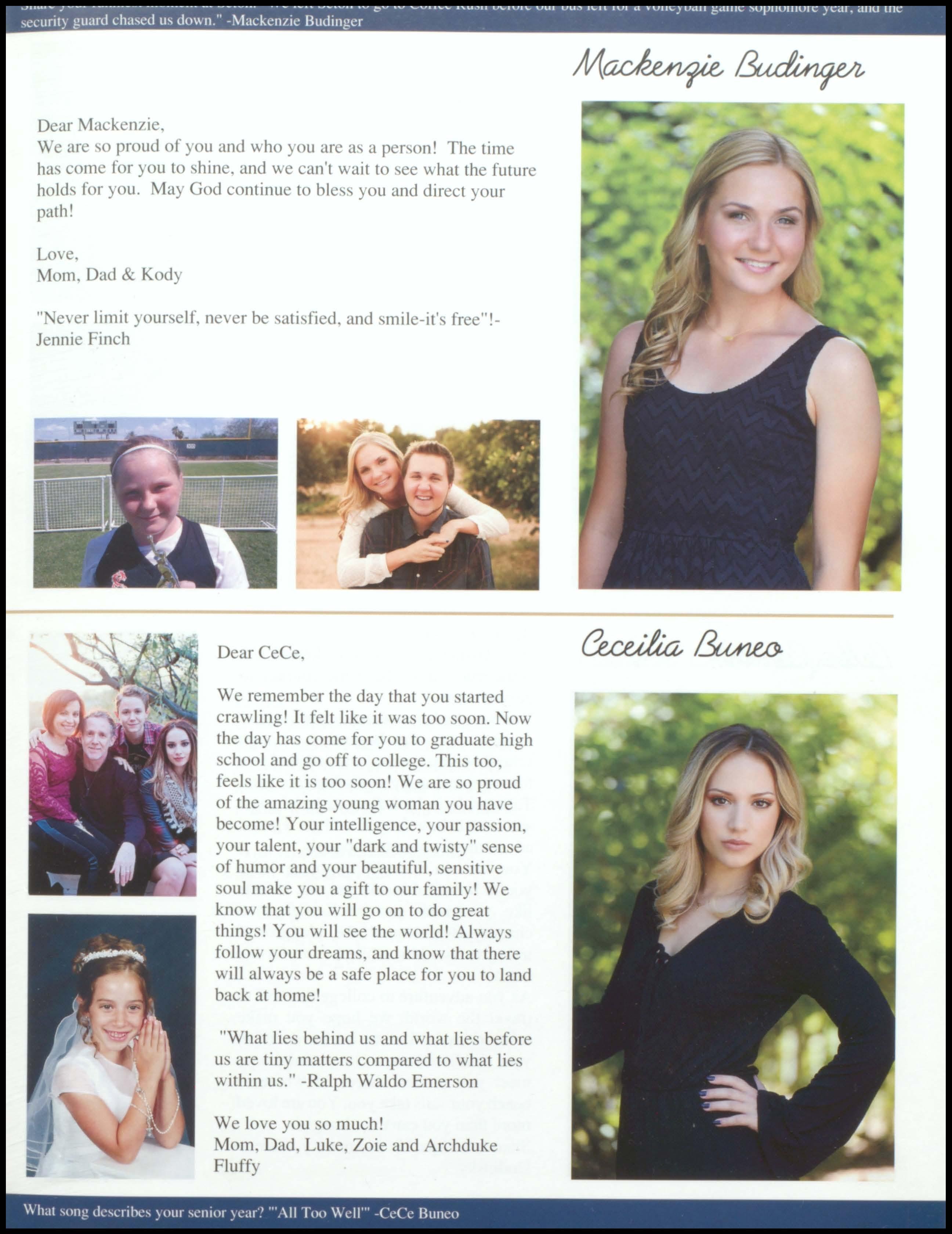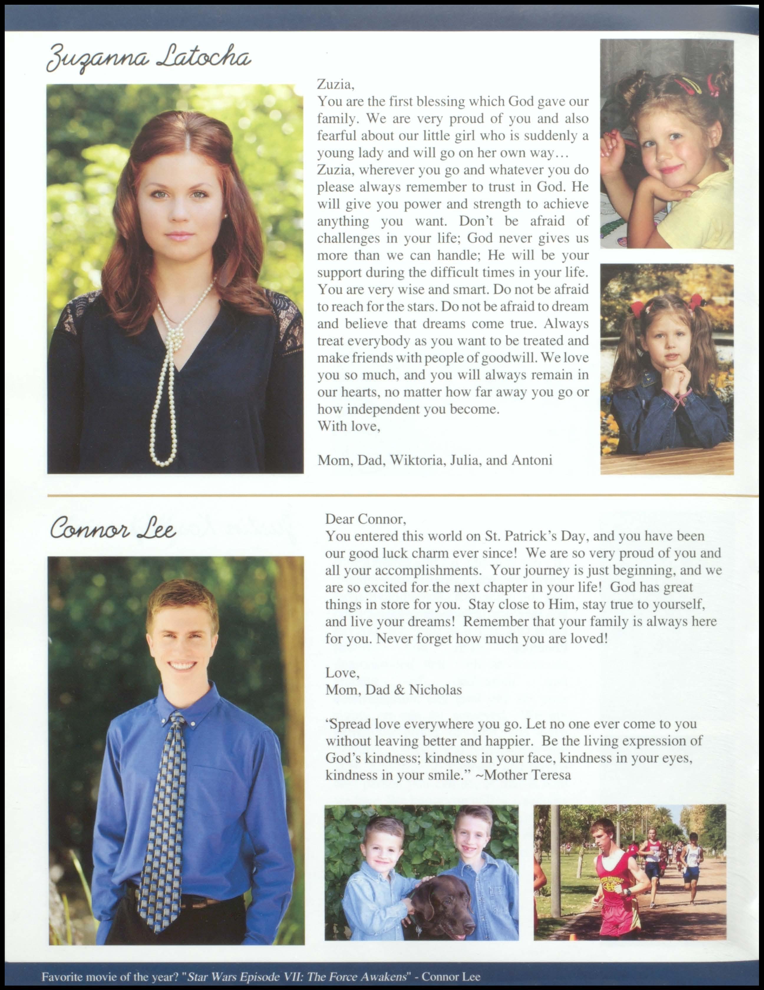 It' hard for us to believe that 17 years have pa ed and you will soon be graduating from high school. We have een you blos om into the mo t amazing young lady. You have worked hard and made such good choice . You are a strong leader, a great friend, a wonderful sister, and you make u very proud parent You are mart, faithful, confident, independent, athletic and have a great sense of humor. Stay true to what you value and continue to use all of your God given talents. You, our love, are going to do great things! Keep smiling that beautiful smile. We love you unconditionally!!!
