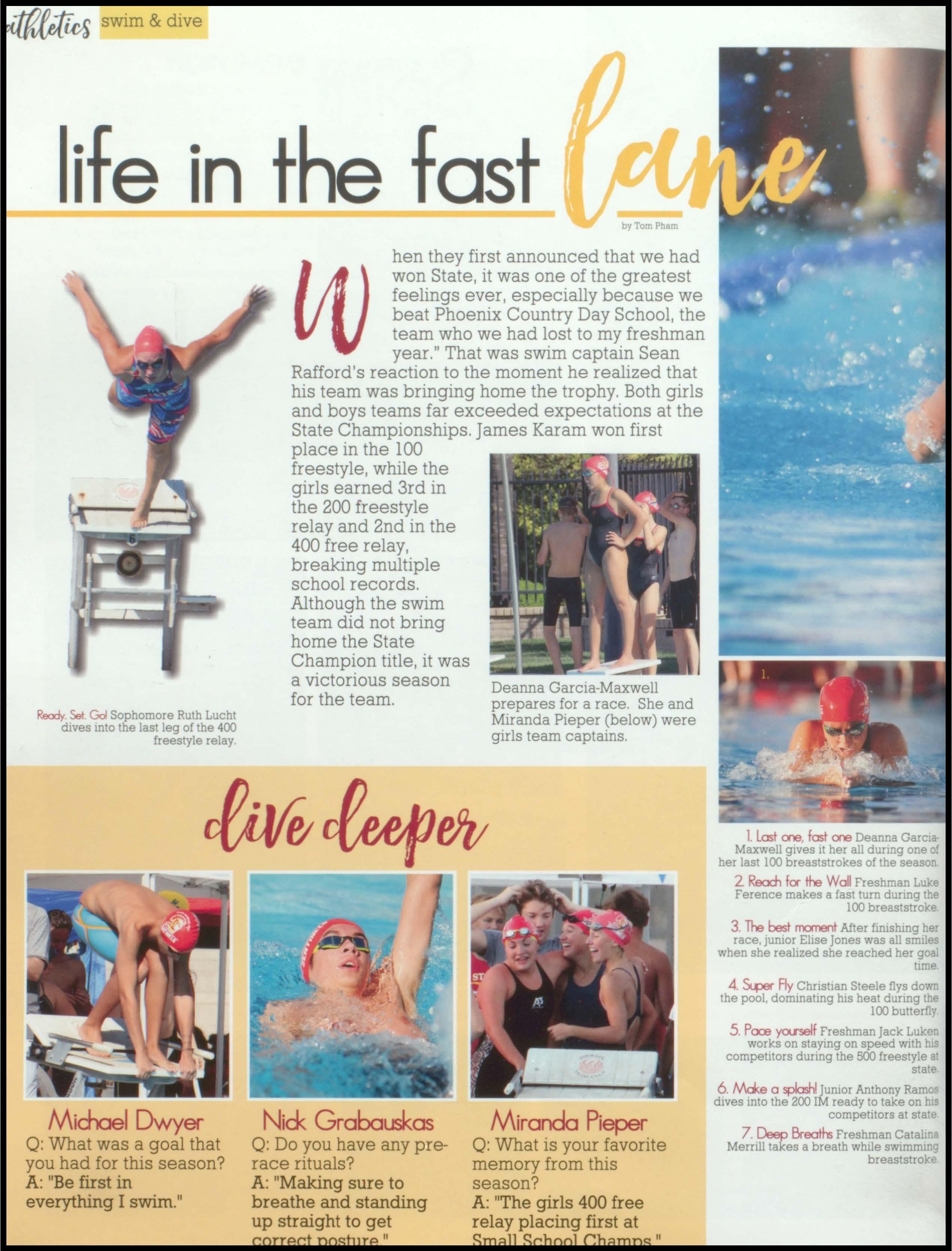hen they first announced that we had won State, it was one of the greatest feelings ever, especially because we beat Phoenix Country Day School, the team who we had lost to my freshman year." That was swim captain Sean Rafford's reaction to the moment he realized that his team was bringing home the trophy. Both girls and boys teams far exceeded expectations at the State Championships. James Karam won first place in the l 00 freestyle, while the girls earned 3rd in the 200 freestyle relay and 2nd in the 400 free relay, breaking multiple school records. Although the swim team did not bring home the State Champion title, it was a victorious season for the team.