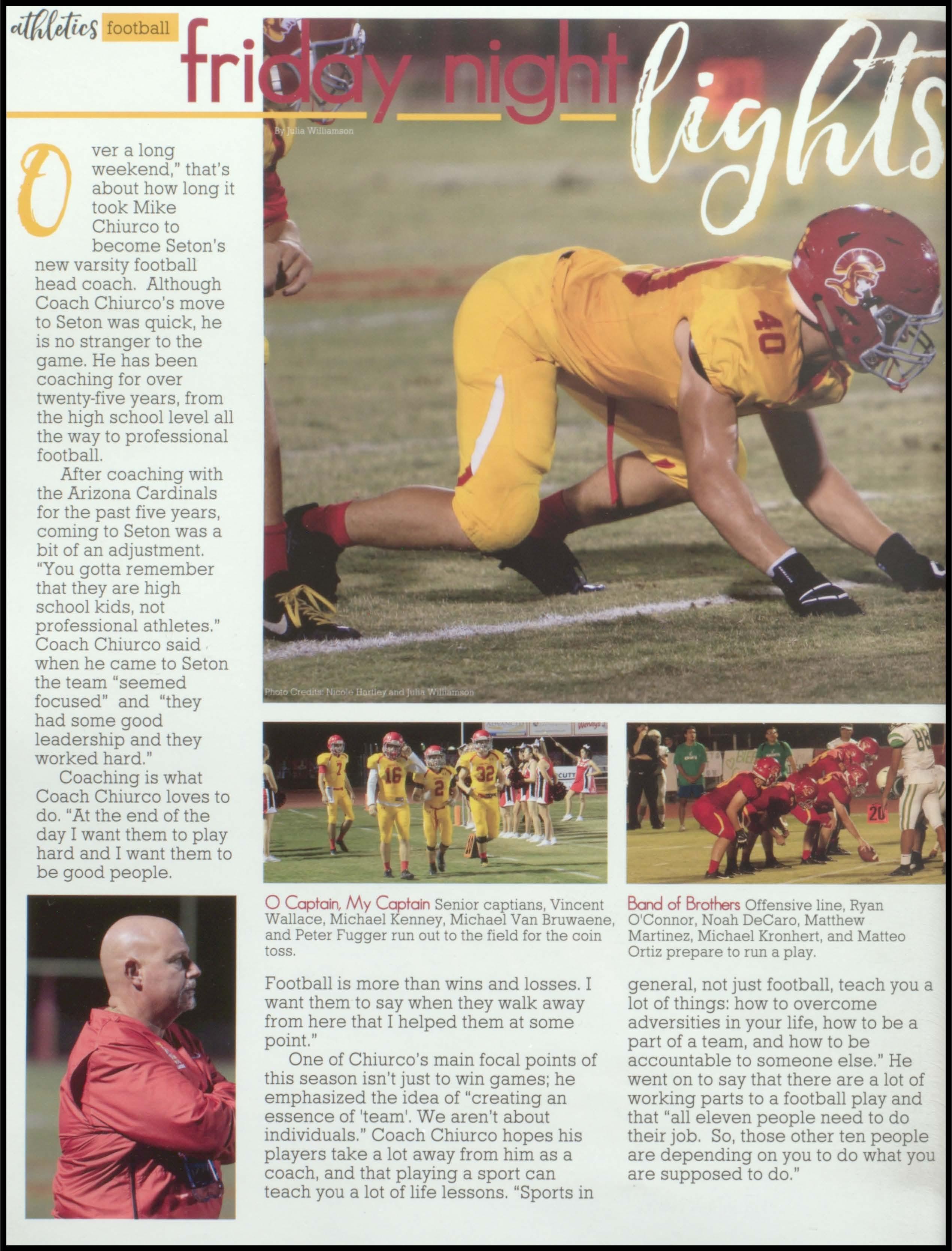 After coaching with the Arizona Cardinals for the past five years, coming to Seton was a bit of an adjustment. "You gotta remember that they are high school kids, not professional athletes." Coach Chiurco said when he came to Seton the team "seemed focused" and "they had some good leadership and they worked hard."