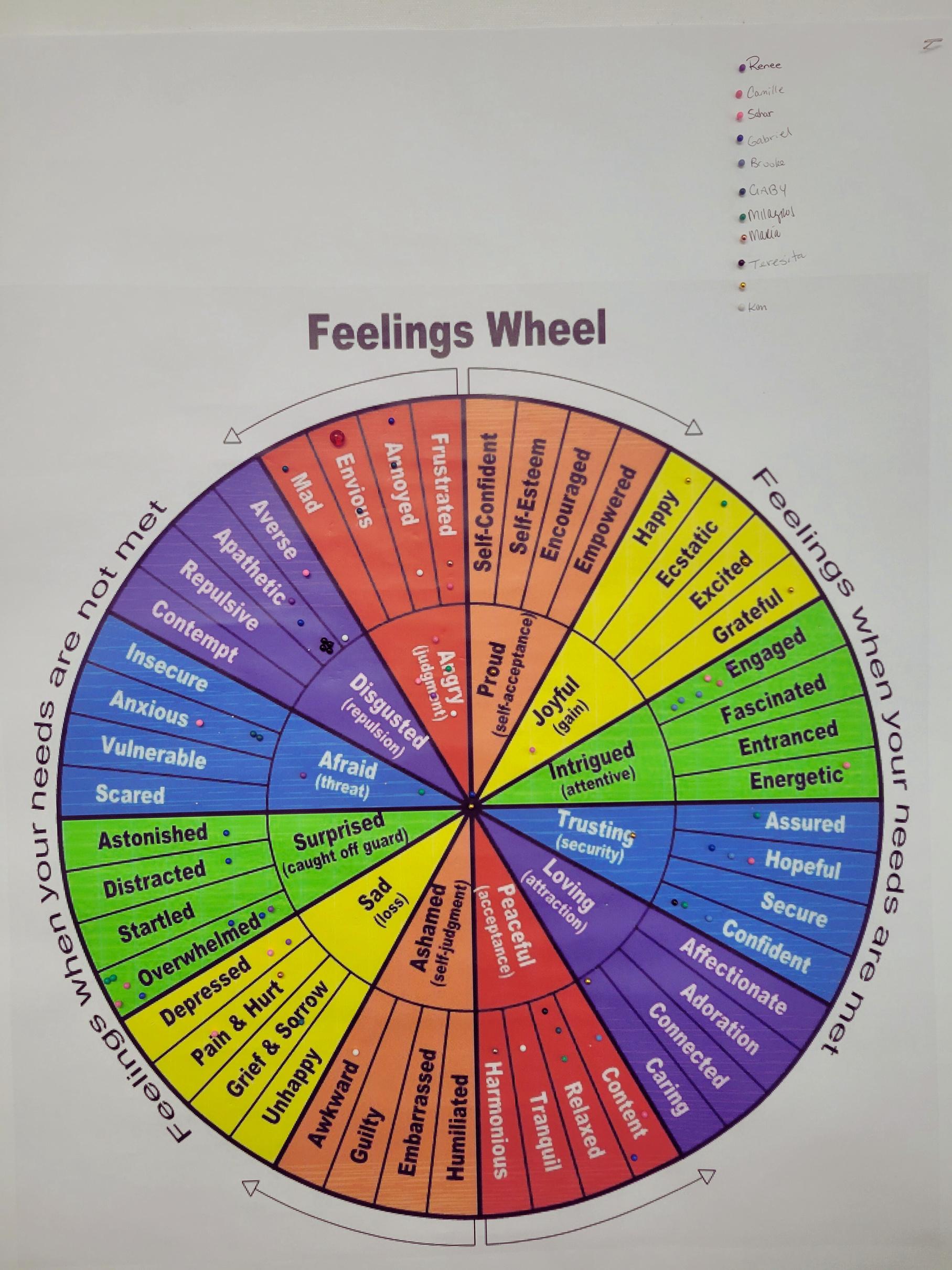 A practice to normalize feelings in the Studio. In every class students “pin up” their feelings and open up at will to talk about their emotions. This practice allows me to see where students are at so I can support them. Also, it creates empathy among the students.