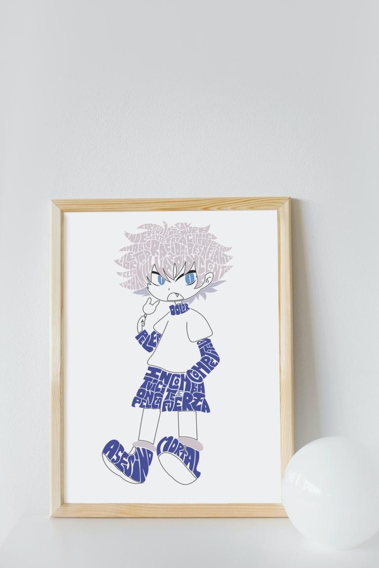 En este acercamiento hacia los caligramas se tuvo que escoger un personaje de cualquiera de estas categorías: Películas, videojuegos y series. El personaje seleccionado fue killua de la serie estilo anime Hunter x Hunter, con el cual se realizo una investigación de historia, personalidad, y aspecto del personaje para seleccionar palabras o frases que se fueron poniendo y adaptando a la forma del personaje para asi crear el boceto. Se procedió a tomar el boceto para digitalizarlo en ilustrator, para ello se tuvo que tener cuidado al momento de ver el espaciado entre las letras y las líneas que realice, debido a que fuera de la vista de ilustrator estas se ven diferente ya sea de tamaño o color.