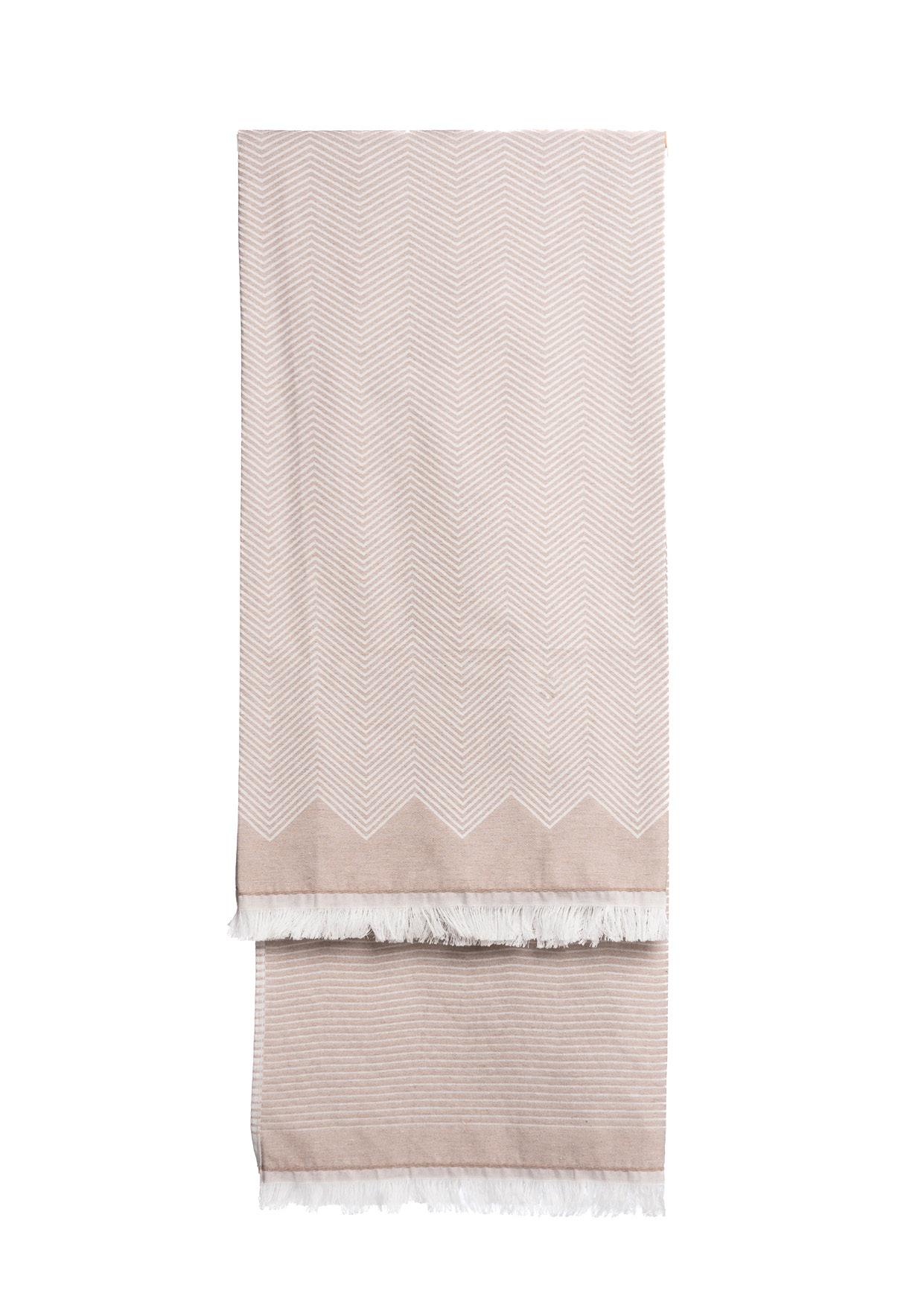 For the hamam towel and plaid, we offer a single design featuring an abstract pattern in two timeless and easily stylable colors: light gray/white and sand/white. Both items are versatile all-season pieces that can be used in various ways. The hamam towel is an ideal bathroom or beach companion. Ready to offer comfort after a refreshing swim or to add a stylish touch to your summer outfits as a scarf.
