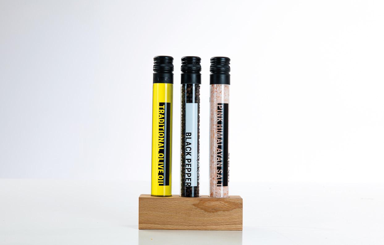 5-Piece cooking box with 5 rPET tubes. The letterbox gift pack includes Himalayan salt, black pepper and 3 types of olive oil from Liquido d’Oro; truffle, chili pepper and garlic.