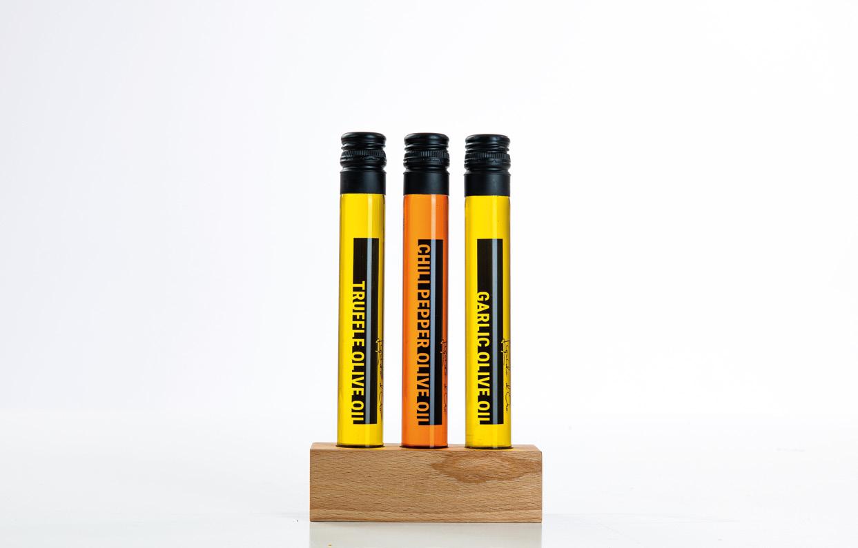 5-Piece cooking box with 5 glass tubes. The craft giftbox includes Himalayan salt, black pepper and 3 types of olive oil from Liquido d’Oro; truffle, chili pepper and garlic.
