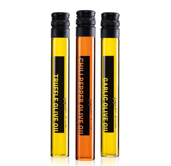 3-Piece olive oil box filled with 3 glass 100 ML tubes of flavourful olive oils from Liquido d’Oro. The craft giftbox includes truffle, chili pepper and garlic olive oils.