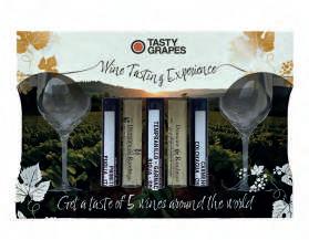 Wine tasting in a craft giftbox consisting of 5 glass 100 ML tubes with different wines from France (14% vol), Chile (13.5% vol), Spain (13% vol), Italy (14% vol) and New Zealand (12% vol).