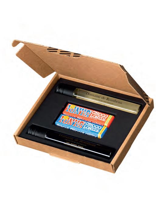 4-piece mini wine tasting in a letterbox gift pack with 2 rPET 100 ML tubes of wines from Domaine de Rombeau combined with 2 mini bars from Tony’s Chocolonely. The tasting includes a red (14.5% vol) and a white wine (13.5% vol) and mini bars in dark and milk chocolate flavors.