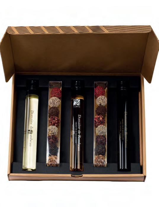 Wine tasting in a craft giftbox with 4 glass 100 ML tubes of wines from Domaine de Rombeau and chocolate truffles. The tasting includes 2 red (14.5% vol) and 2 white wines (13.5% vol) and 8 chocolate truffles.