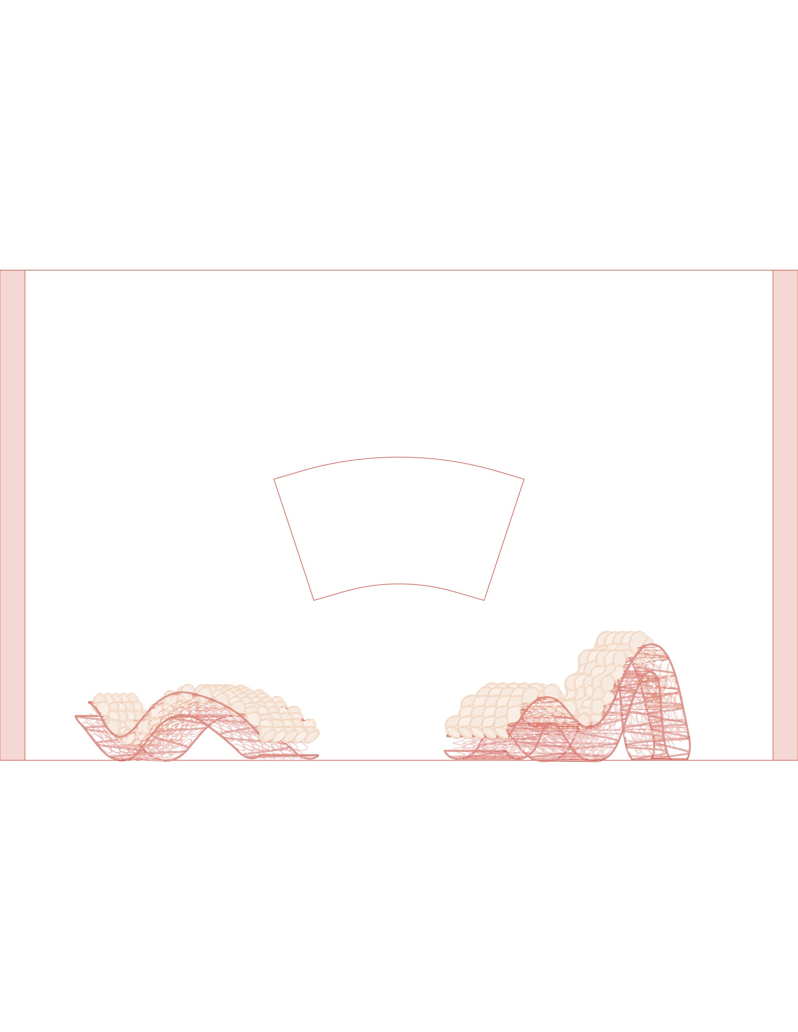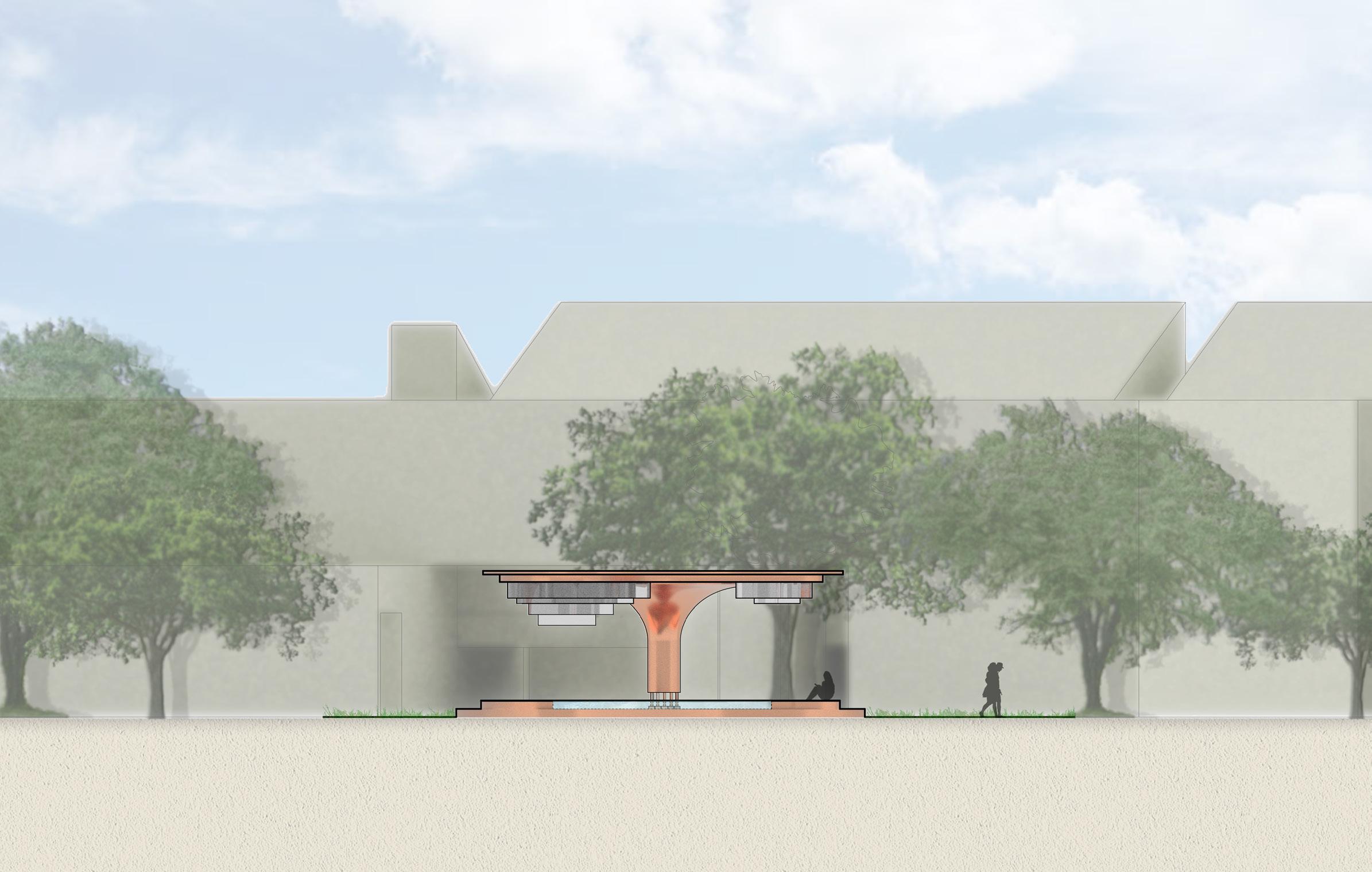 Inspired by the organic, wave-like forms of Lynda Benglis’ Summer Pavilion, this project reinterprets sculptural expression as inhabitable space. The pavilion functions as a resting and gathering area, where curved surfaces create integrated seating and moments for pause. Its funnel-like form collects rainwater and directs it toward a central pond, transforming environmental function into a visible and experiential feature. Openings in the roof allow natural light to filter through, while a suspended mesh layer reinforces the fluid geometry and softens the space below. The design balances expressive form with usability, creating a structure that is both visually dynamic and comfortably inhabitable.