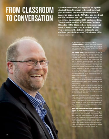 CR: I remember one meeting I had with a grad stu dent. They were showing me a film they had made for a calc class to show off some theorem…and they had a lightsaber duel, and I thought that was hilari ous. Some of that “informal” time was really fun. What exciting things are going on in EE at Tufts, both as chair and as a student? What drew you to EE? What piques your interest?