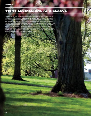 TUFTS ENGINEERING AT A GLANCE TUFTS SCHOOL OF ENGINEERING COMBINES THE CHALLENGE OF A RESEARCH UNIVERSITY AND THE INTELLECTUAL CHARGE OF A LIBERAL ARTS COLLEGE ATMOSPHERE. STUDENTS HAVE AN ABUNDANCE OF OPPORTUNITIES TO PARTICIPATE IN FACULTY RESEARCH AND TO BENEFIT FROM OUTSTANDING TEACHING. READ ON FOR A GLIMPSE INTO THE LIFE OF A TUFTS ENGINEER, BOTH IN AND OUT OF THE CLASSROOM.