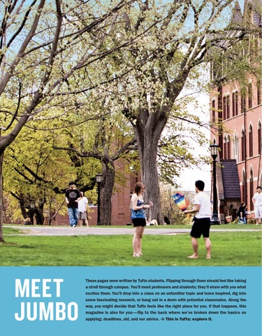 These pages were written by Tufts students. Flipping through them should feel like taking a stroll through campus. You’ll meet professors and students; they’ll share with you what excites them. You’ll drop into a class on an unfamiliar topic and leave inspired, dig into some fascinating research, or hang out in a dorm with potential classmates. Along the way, you might decide that Tufts feels like the right place for you. If that happens, this magazine is also for you— flip to the back where we’ve broken down the basics on applying: deadlines, aid, and our advice. This is Tufts; explore it.
