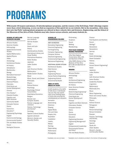 PROGRAMS With nearly 150 majors and minors, 30 interdisciplinary programs, and the courses of the ExCollege, Tufts’ offerings require more than a brief skimming, so you can find an expansion of this quick list on our website. But in the meantime, skim away. Just note that Tufts’ undergraduate programs are offered in three schools: Arts and Sciences, Engineering, and the School of the Museum of Fine Arts at Tufts. Students may take classes across schools, and many students do. SCHOOL OF ARTS AND SCIENCES MAJORS