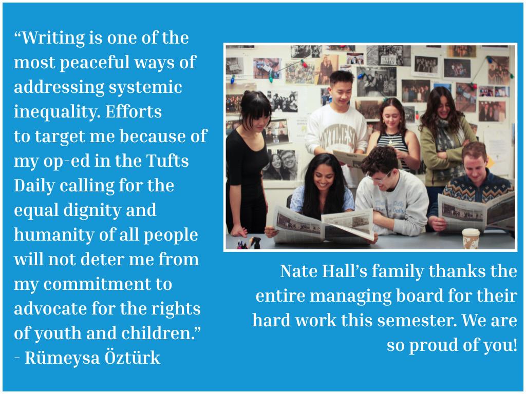 journalism. Additionally, and importantly, you all made your voices heard. The Daily published a number of op-eds regarding the detainment authored by alumni and other members of the Tufts and surrounding communities. Looking to the future, the Daily remains committed to reporting and seeking answers on the details of the detainment.