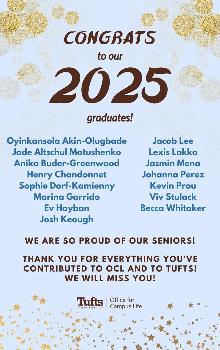 As the year closes this May and I walk around Tufts’ campus, I see the trees have turned pink with flowers, and tulips grow at the base of lamp posts. After a long, cold winter, it finally feels like summer. To the rising sophomores, juniors, and seniors, I can’t wait to see you all again in the fall. To the graduating seniors, please keep in touch!