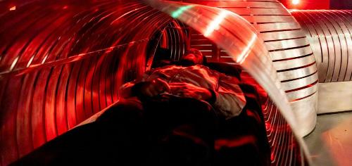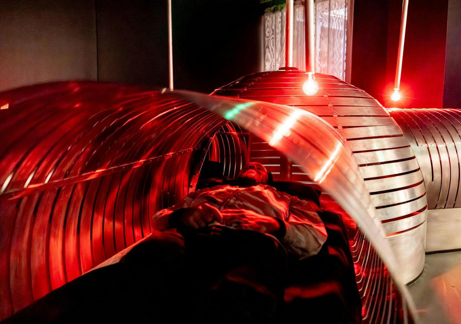 There was music and food, and as I entered, I saw a metal contraption that looked like it belonged in some distant future. In an interactive art piece called “Hotel Room #2: Communal Dreams,” three people at a time lie down in the apparatus while pulses of light, sound and motion guide them into a collective dream state.