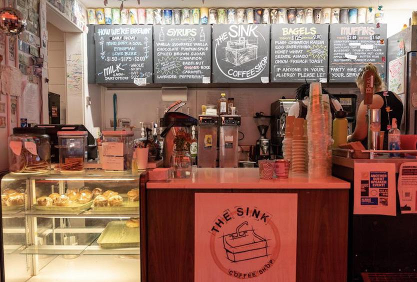 forward” voucher system for students who might not be able to afford their drinks. Fliers and posters line the drink pick-up counter, each promoting different student organizations and events. The Sink has a long history of hosting special drink menus for holidays, seasons and collaborations with student organizations for heritage months. Most recently, The Sink collaborated with PERIOD at Tufts for Period Action Day, Tufts Association of Latin American Students for Hispanic Heritage Month and WMFO, Tufts’ student and community-operated radio station. The Sink’s employees value identity-based drinks, and their collaborations with the identity centers range from drinks that celebrate Black Legacy Month with the Africana Center to events with the LGBT Center, like the recent “performative masc lesbian contest,” co-hosted by the LGBT Center and The Sink.