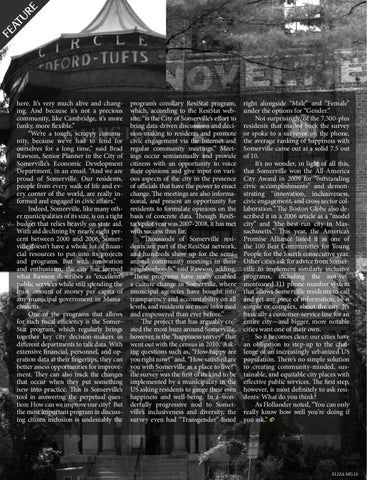 RE FE AT U here. It’s very much alive and changing. And because it’s not a precious community, like Cambridge, it’s more funky, more flexible.” “We’re a tough, scrappy community, because we’ve had to fend for ourselves for a long time,” said Brad Rawson, Senior Planner in the City of Somerville’s Economic Development Department, in an email. “And we are proud of Somerville. Our residents, people from every walk of life and every corner of the world, are really informed and engaged in civic affairs.” Indeed, Somerville, like many other municipalities of its size, is on a tight budget that relies heavily on state aid. With aid declining by nearly eight percent between 2000 and 2006, Somerville doesn’t have a whole lot of financial resources to put into its projects and programs. But with innovation and enthusiasm, the city has formed what Rawson describes as “excellent” public services while still spending the least amount of money per capita of any municipal government in Massachusetts. One of the programs that allows for such fiscal efficiency is the SomerStat program, which regularly brings together key city decision-makers in different departments to talk data. With extensive financial, personnel, and operation data at their fingertips, they can better assess opportunities for improvement. They can also track the changes that occur when they put something new into practice. This is Somerville’s tool in answering the perpetual question: How can we improve our city? But the most important program in discussing citizen inclusion is undeniably the