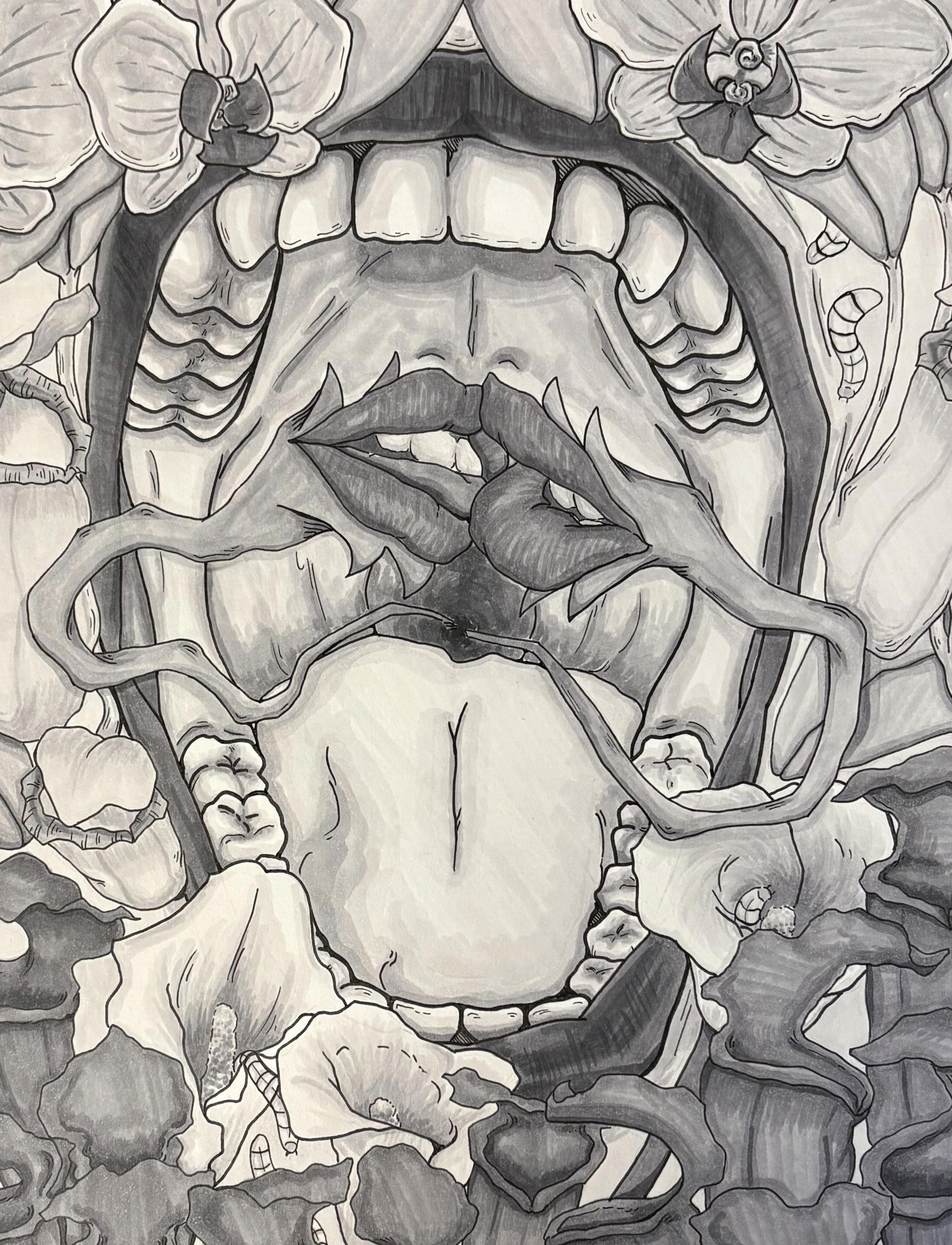 His throat was hot and miry like a snake’s bowels. As I slid down, each muscle slithered over to caress me, choke me, blanket me with the reverb of the heart that had once pounded in sync beside mine. I tried to stop myself. I embedded my fingers into the rubbery walls of his throat, but there was little to grip, and his saliva was already trying to