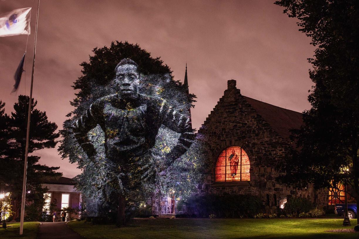 One notable project has involved collaboration with the Center for Study of Race and Democracy, documenting sites related to the African American Freedom trail on Tufts’ campuses. This work has included numerous public events; one such event in 2018 included photos of Black students projected on the central part of Tufts campus, includ-