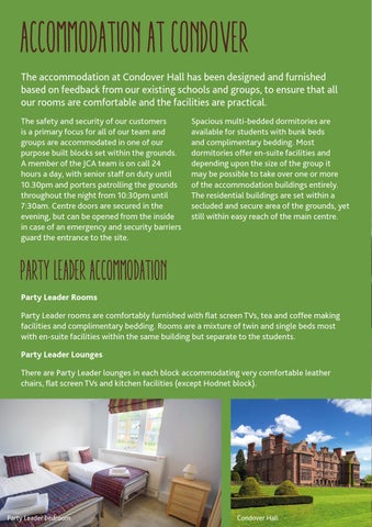 Accommodation at Condover The accommodation at Condover Hall has been designed and furnished based on feedback from our existing schools and groups, to ensure that all our rooms are comfortable and the facilities are practical. The safety and security of our customers is a primary focus for all of our team and groups are accommodated in one of our purpose built blocks set within the grounds. A member of the JCA team is on call 24 hours a day, with senior staff on duty until 10.30pm and porters patrolling the grounds throughout the night from 10:30pm until 7:30am. Centre doors are secured in the evening, but can be opened from the inside in case of an emergency and security barriers guard the entrance to the site.