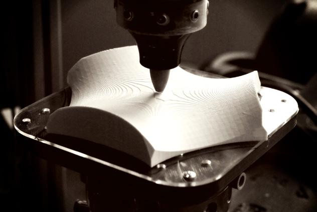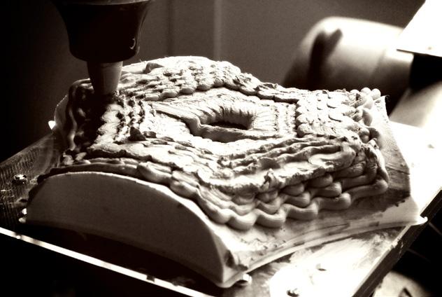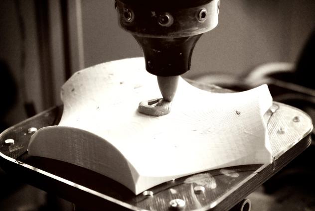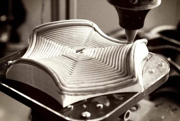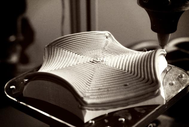 As the base was flat, we 3D-Printed a non-planar jig to put on the base for the object to be clay printed where the toolpath follows the topology of the jig